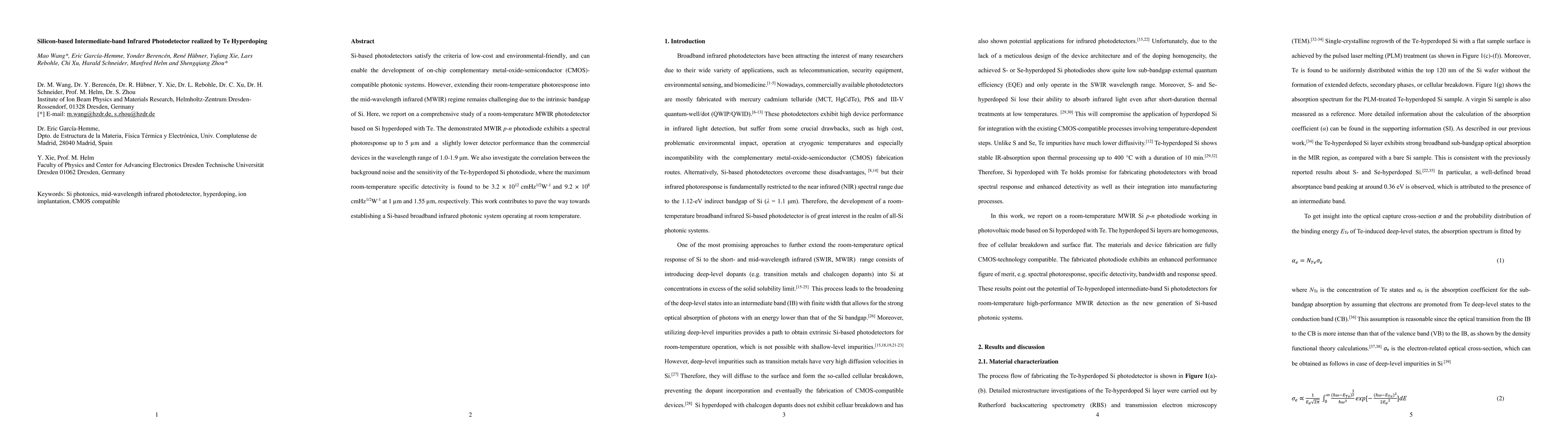 A comprehensive experimental approach was employed to investigate the properties of Te-hyperdoped Si photodetectors.
