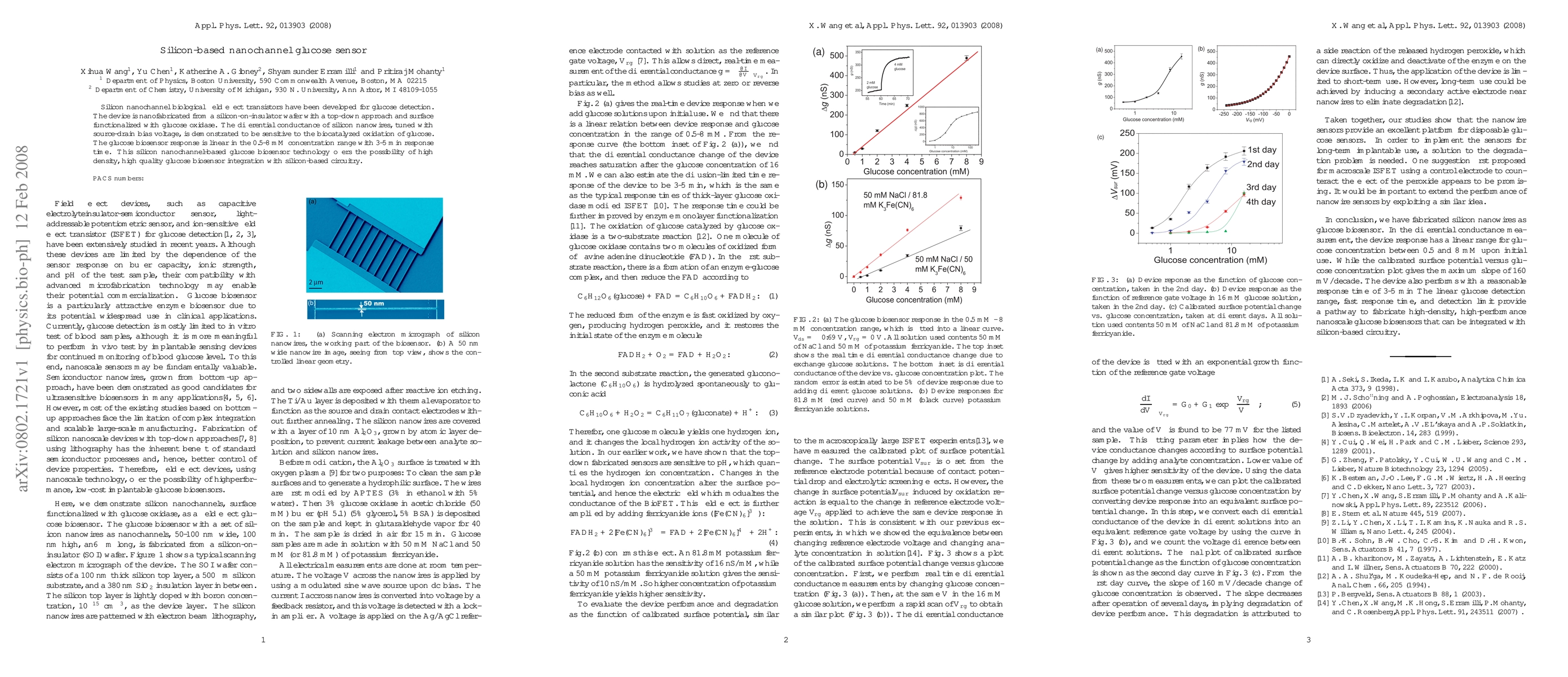 Silicon nanochannel biological field effect transistors are developed for glucose detection, showing a linear response in the 0.5-8 mM range with a 3-5 min response time, offering high-density integration potential with silicon-based circuitry.