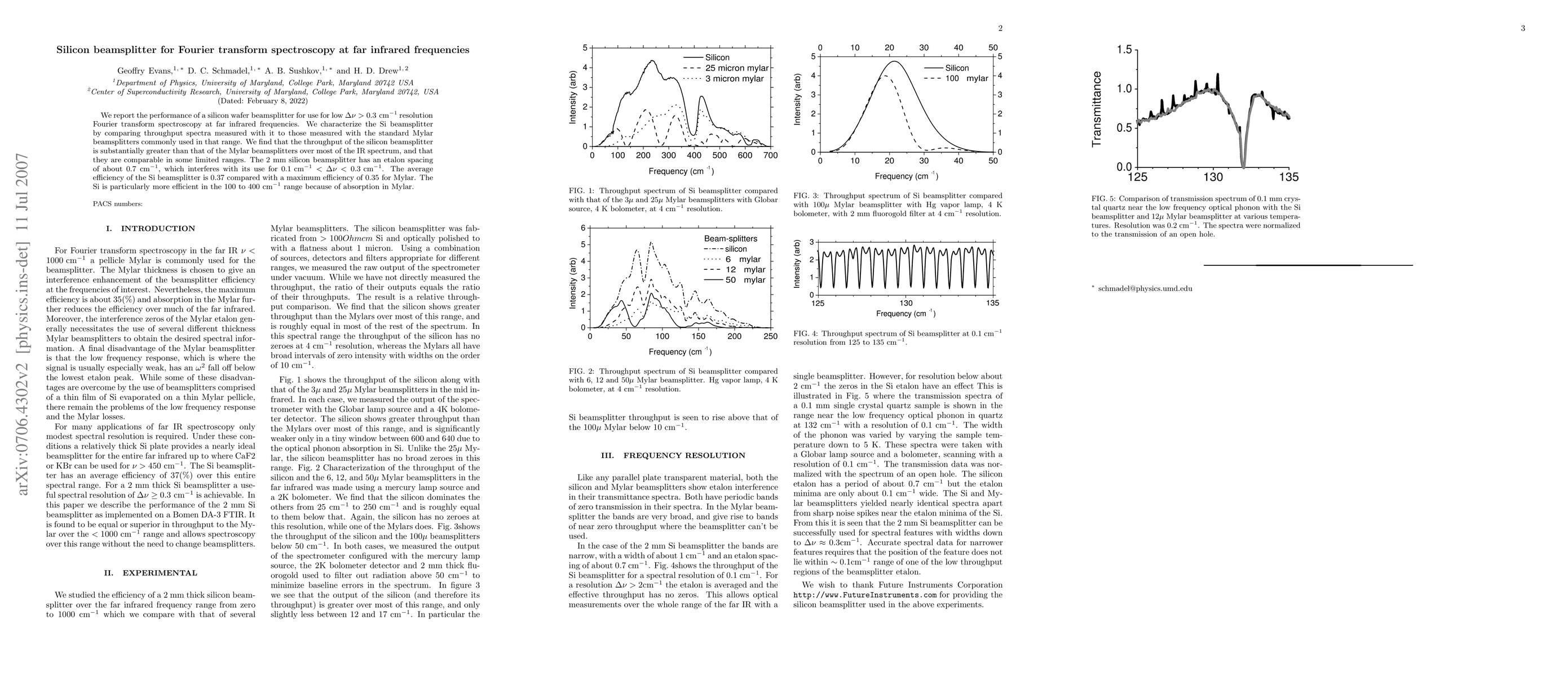 We report the performance of a silicon wafer beamsplitter for use for low $\Delta\nu>0.3 cm^{-1}$ resolution Fourier transform spectroscopy at far infrared frequencies. We characterize the Si beamsplitter by comparing throughput spectra measured with it to those measured with the standard Mylar beamsplitters commonly used in that range. We find that the throughput of the silicon beamsplitter is substantially greater than that of the Mylar beamsplitters over most of the IR spectrum, and that they are comparable in some limited ranges. The 2 mm silicon beamsplitter has an etalon spacing of about 0.7 cm^{-1}, which interferes with its use for $0.1 cm^{-1}<\Delta\nu < 0.3cm^{-1}$. The average efficiency of the Si beamsplitter is 0.37 compared with a maximum efficiency of 0.35 for Mylar. The Si is particularly more efficient in the 100 to 400 cm^{-1} range because of absorption in Mylar.