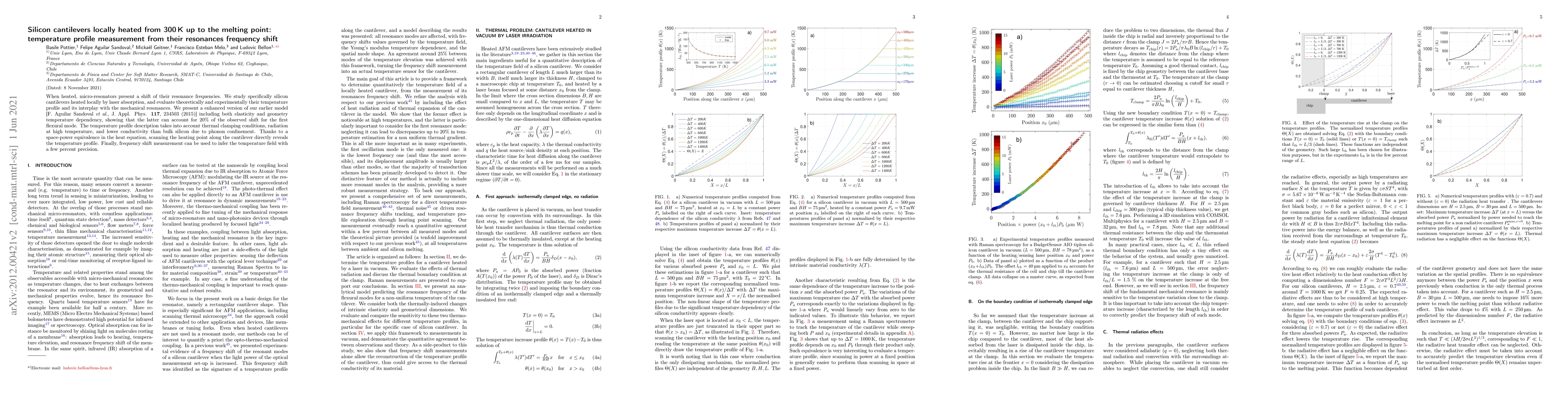 This paper investigates the temperature profile of locally heated silicon cantilevers using laser absorption, correlating the resonance frequency shift with temperature changes. An enhanced model incorporating elasticity and geometry dependency explains 20% of the observed frequency shift, and precise temperature field inference is achieved through frequency measurements.