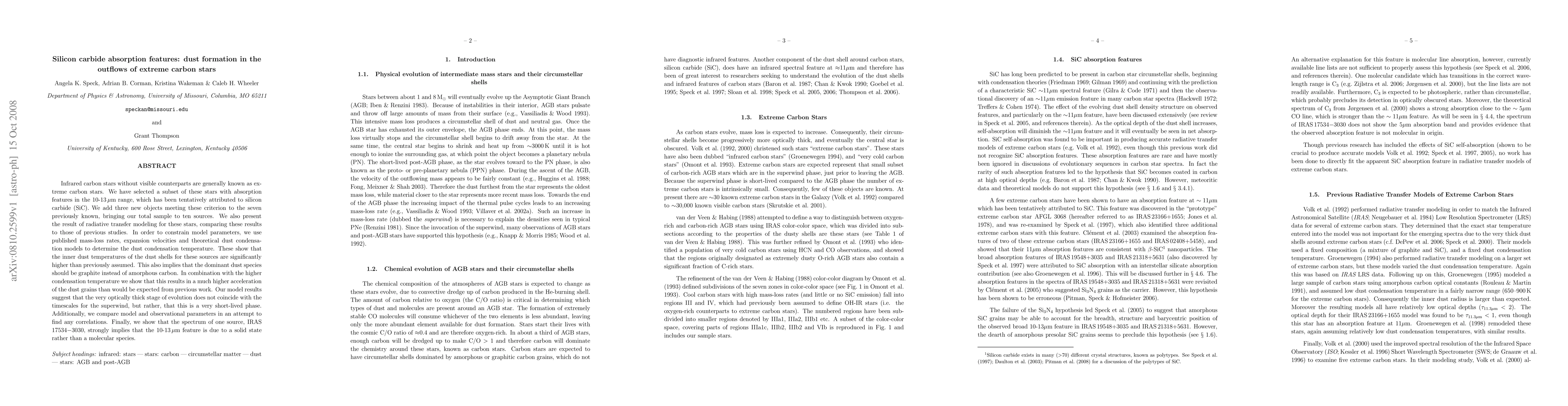 Infrared carbon stars without visible counterparts are generally known as extreme carbon stars. We have selected a subset of these stars with absorption features in the 10-13 $\mu$m range, which has been tentatively attributed to silicon carbide (SiC). We add three new objects meeting these criterion to the seven previously known, bringing our total sample to ten sources. We also present the result of radiative transfer modeling for these stars, comparing these results to those of previous studies. In order to constrain model parameters, we use published mass-loss rates, expansion velocities and theoretical dust condensation models to determine the dust condensation temperature. These show that the inner dust temperatures of the dust shells for these sources are significantly higher than previously assumed. This also implies that the dominant dust species should be graphite instead of amorphous carbon. In combination with the higher condensation temperature we show that this results in a much higher acceleration of the dust grains than would be expected from previous work. Our model results suggest that the very optically thick stage of evolution does not coincide with the timescales for the superwind, but rather, that this is a very short-lived phase. Additionally, we compare model and observational parameters in an attempt to find any correlations. Finally, we show that the spectrum of one source, IRAS 17534$-$3030, strongly implies that the 10-13 $\mu$m feature is due to a solid state rather than a molecular species.