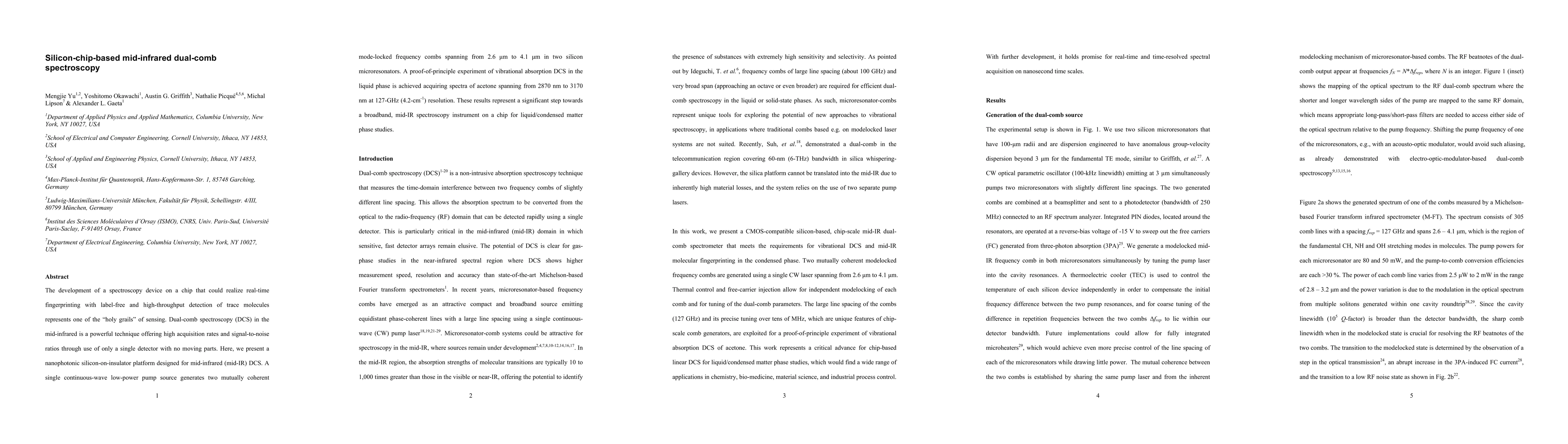 This paper introduces a silicon-chip-based platform for mid-infrared dual-comb spectroscopy using microresonators, demonstrating high-precision spectral measurement from acetone in the liquid phase. The approach promises real-time, label-free, and high-throughput detection of trace molecules, with potential applications in various scientific fields.
