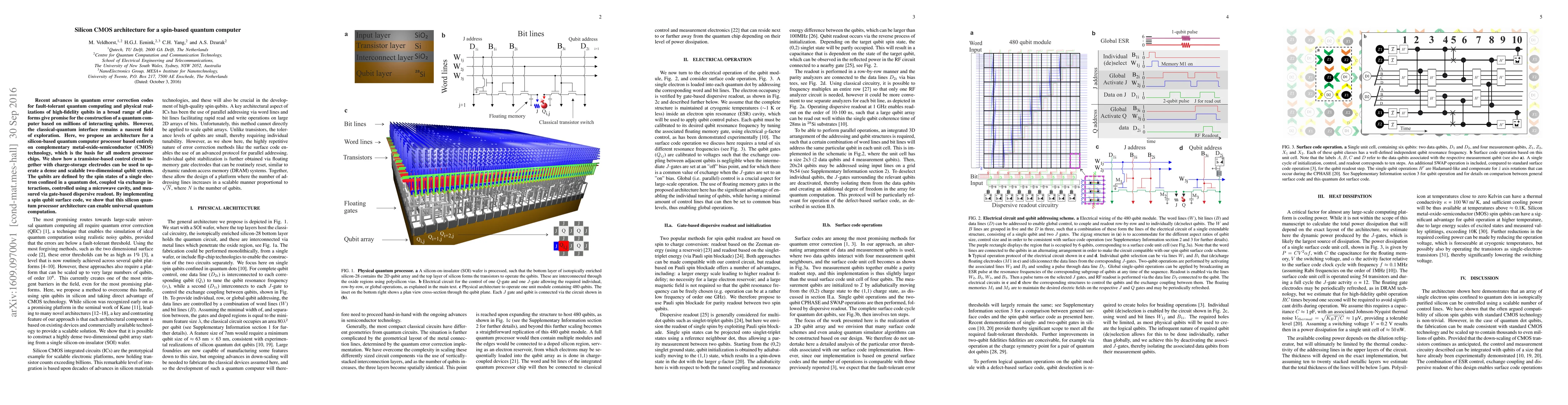 This paper proposes a silicon CMOS architecture for a scalable quantum computer using spin-based qubits in quantum dots, controlled by transistor-based circuits and charge-storage electrodes. The design is compatible with surface code quantum error correction, enabling large-scale quantum computation.