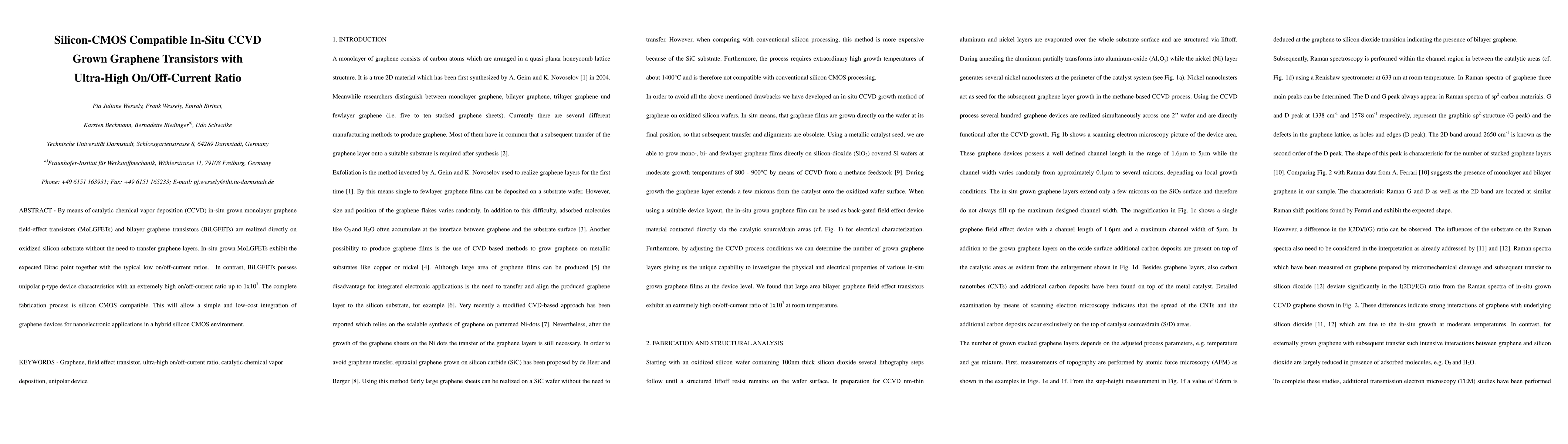 This paper presents silicon CMOS compatible in-situ grown monolayer and bilayer graphene transistors fabricated via catalytic chemical vapor deposition, showing that bilayer graphene transistors achieve ultra-high on/off-current ratios up to 1E7, suitable for integration into nanoelectronic applications.