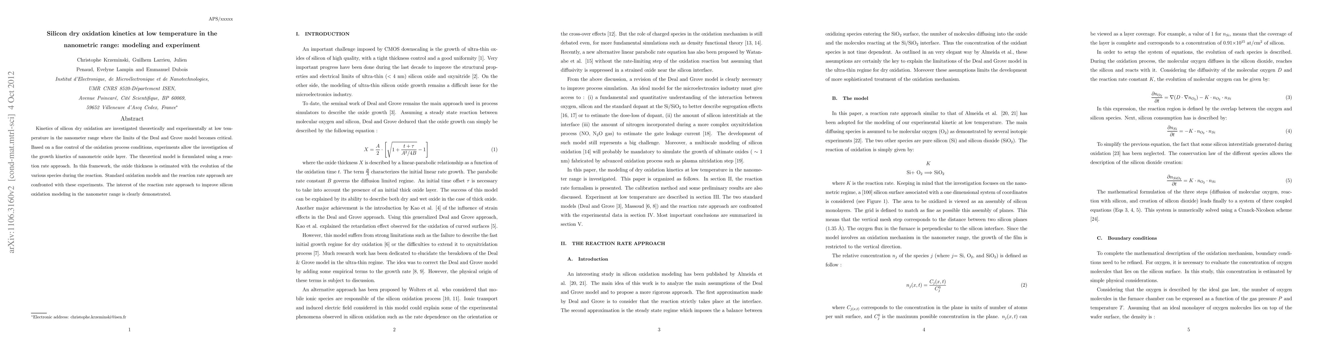 This paper investigates the kinetics of silicon dry oxidation at low temperatures in the nanometric range, where traditional models fail. Experimental and theoretical approaches are used to study the growth of nanometric oxide layers, demonstrating the effectiveness of a reaction rate approach over standard models for better oxidation modeling.