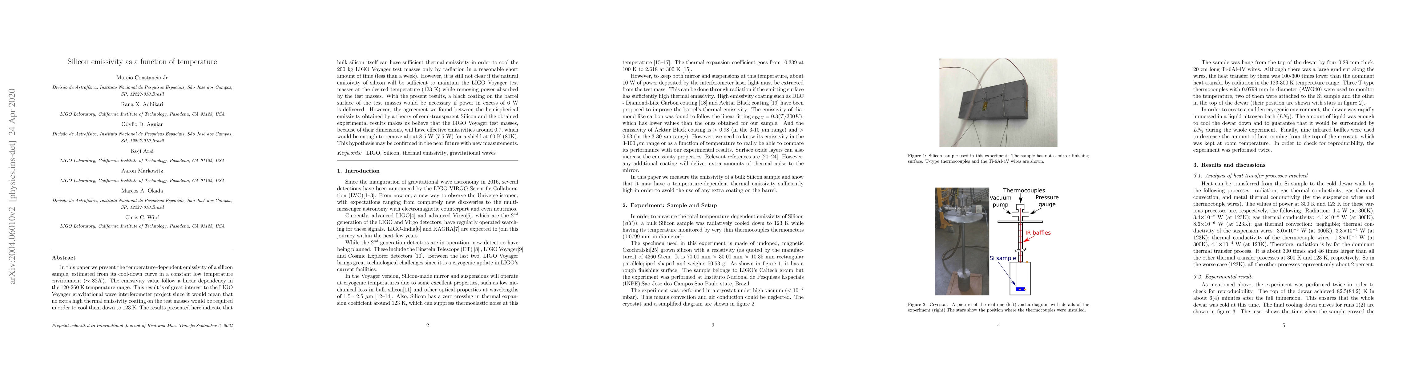 In this paper we present the temperature-dependent emissivity of a silicon sample, estimated from its cool-down curve in a constant low temperature environment ($\approx$ 82K). The emissivity value follow a linear dependency in the 120-260 K temperature range. This result is of great interest to the LIGO Voyager gravitational wave interferometer project since it would mean that no extra high thermal emissivity coating on the test masses would be required in order to cool them down to 123 K. The results presented here indicate that bulk silicon itself can have sufficient thermal emissivity in order to cool the 200 kg LIGO Voyager test masses only by radiation in a reasonable short amount of time (less than a week). However, it is still not clear if the natural emissivity of silicon will be sufficient to maintain the LIGO Voyager test masses at the desired temperature (123 K) while removing power absorbed by the test masses. With the present results, a black coating on the barrel surface of the test masses would be necessary if power in excess of 6 W is delivered. However, the agreement we found between the hemispherical emissivity obtained by a theory of semi-transparent Silicon and the obtained experimental results makes us believe that the LIGO Voyager test masses, because of their dimensions, will have effective emissivities around 0.7, which would be enough to remove about 8.6 W (7.5 W) for a shield at 60 K (80K). This hypothesis may be confirmed in the near future with new measurements.