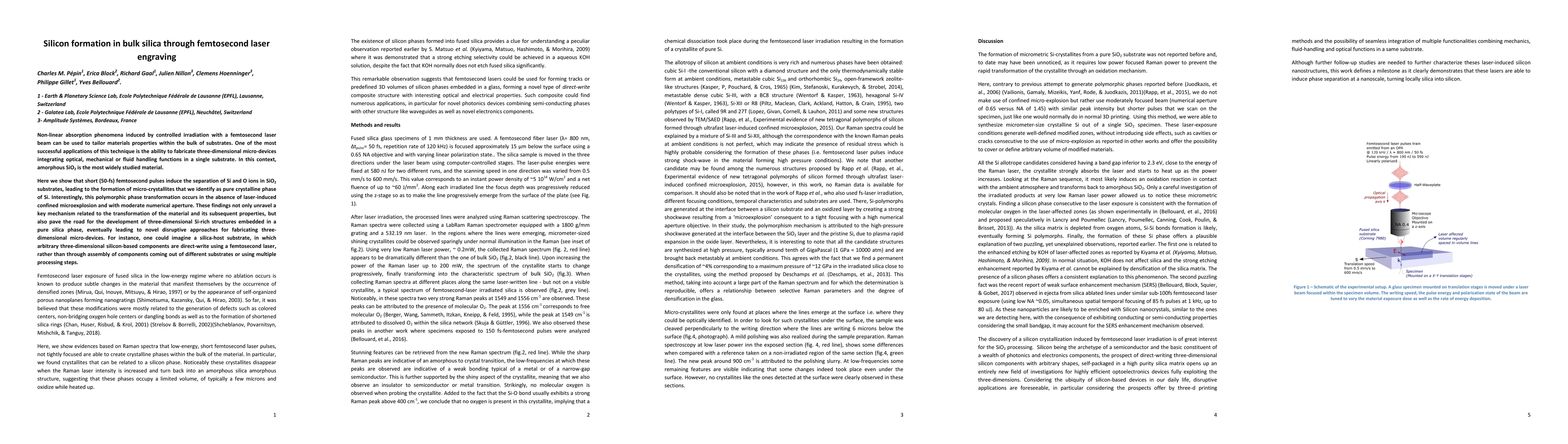 This study demonstrates that femtosecond laser engraving can induce the separation of Si and O ions in amorphous SiO2, resulting in the formation of pure silicon micro-crystallites without requiring microexplosions. This method opens new avenues for creating three-dimensional Si-rich structures within a silica matrix, potentially revolutionizing the fabrication of micro-devices.