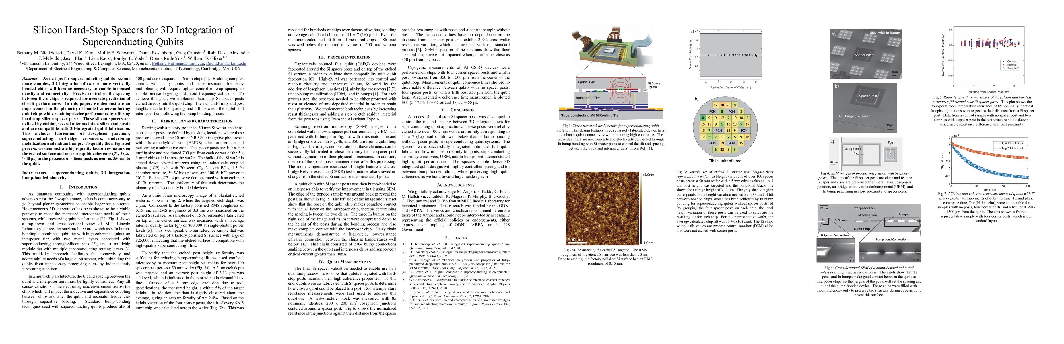 This paper presents silicon hard-stop spacers to enhance the planarity of vertically bonded superconducting qubit chips for 3D integration, maintaining device performance. The spacers enable precise chip spacing and support fabrication of complex circuits, with demonstrated high-quality resonators and qubit coherence exceeding 40 μs.