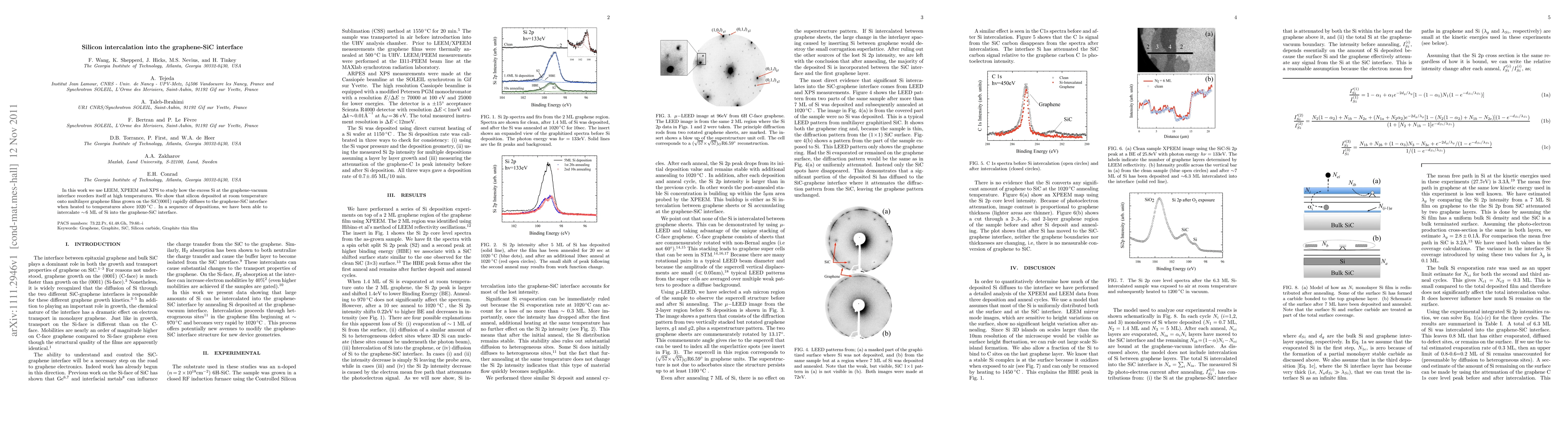 This study investigates the diffusion of silicon deposited on graphene grown on SiC when heated, revealing that silicon intercalates into the graphene-SiC interface at temperatures above 1020°C, achieving up to ~6 ML of silicon intercalation. Techniques like LEEM, XPEEM, and XPS were employed to analyze the process.