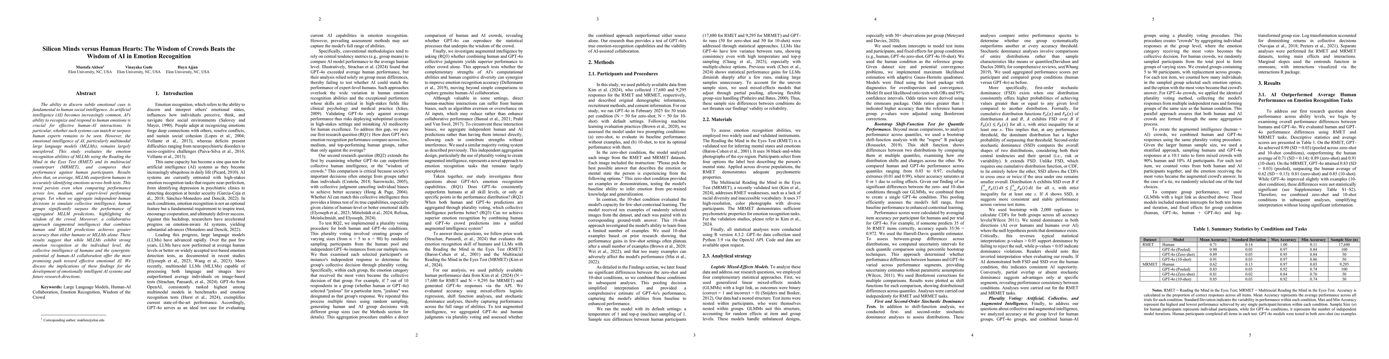 The ability to discern subtle emotional cues is fundamental to human social intelligence. As artificial intelligence (AI) becomes increasingly common, AI's ability to recognize and respond to human emotions is crucial for effective human-AI interactions. In particular, whether such systems can match or surpass human experts remains to be seen. However, the emotional intelligence of AI, particularly multimodal large language models (MLLMs), remains largely unexplored. This study evaluates the emotion recognition abilities of MLLMs using the Reading the Mind in the Eyes Test (RMET) and its multiracial counterpart (MRMET), and compares their performance against human participants. Results show that, on average, MLLMs outperform humans in accurately identifying emotions across both tests. This trend persists even when comparing performance across low, medium, and expert-level performing groups. Yet when we aggregate independent human decisions to simulate collective intelligence, human groups significantly surpass the performance of aggregated MLLM predictions, highlighting the wisdom of the crowd. Moreover, a collaborative approach (augmented intelligence) that combines human and MLLM predictions achieves greater accuracy than either humans or MLLMs alone. These results suggest that while MLLMs exhibit strong emotion recognition at the individual level, the collective intelligence of humans and the synergistic potential of human-AI collaboration offer the most promising path toward effective emotional AI. We discuss the implications of these findings for the development of emotionally intelligent AI systems and future research directions.