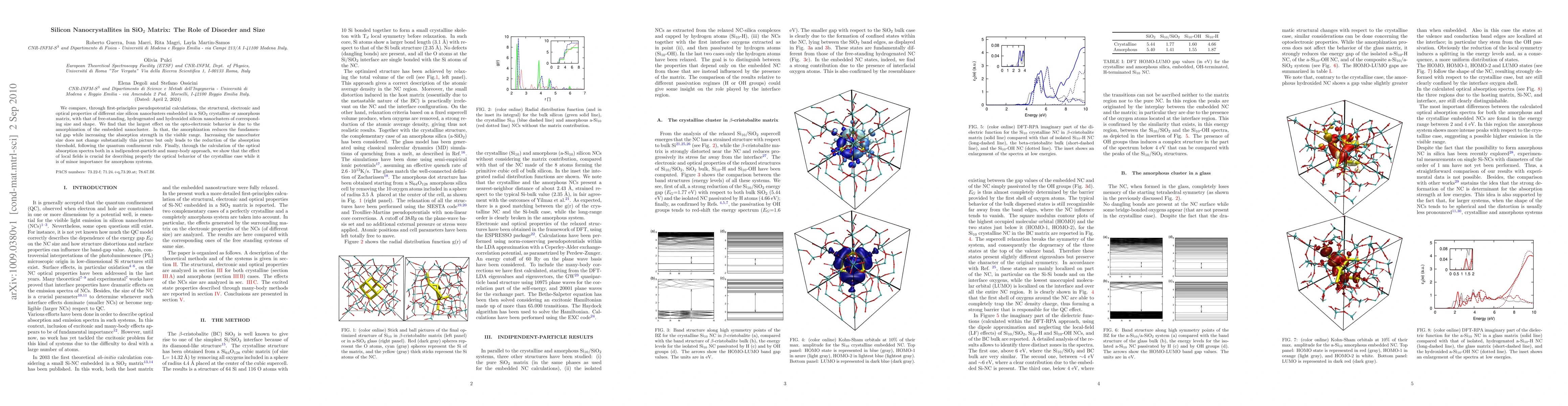 We compare, through first-principles pseudopotential calculations, the structural, electronic and optical properties of different size silicon nanoclusters embedded in a SiO2 crystalline or amorphous matrix, with that of free-standing, hydrogenated and hydroxided silicon nanoclusters of corresponding size and shape. We find that the largest effect on the opto-electronic behavior is due to the amorphization of the embedded nanocluster. In that, the amorphization reduces the fundamental gap while increasing the absorption strength in the visible range. Increasing the nanocluster size does not change substantially this picture but only leads to the reduction of the absorption threshold, following the quantum confinement rule. Finally, through the calculation of the optical absorption spectra both in a indipendent-particle and many-body approach, we show that the effect of local fields is crucial for describing properly the optical behavior of the crystalline case while it is of minor importance for amorphous systems.