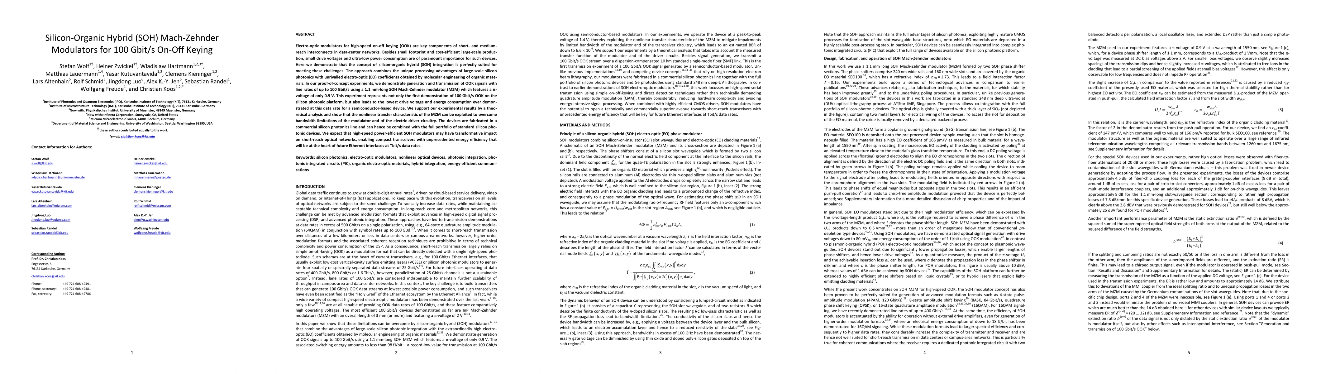 This research demonstrates a silicon-organic hybrid (SOH) Mach-Zehnder modulator capable of transmitting 100 Gbit/s on-off keying signals with a drive voltage of just 0.9 V, achieving the lowest energy consumption for such data rates. The SOH integration leverages the scalability of silicon photonics and the high electro-optic properties of organic materials, potentially revolutionizing high-speed, power-efficient optical networks.
