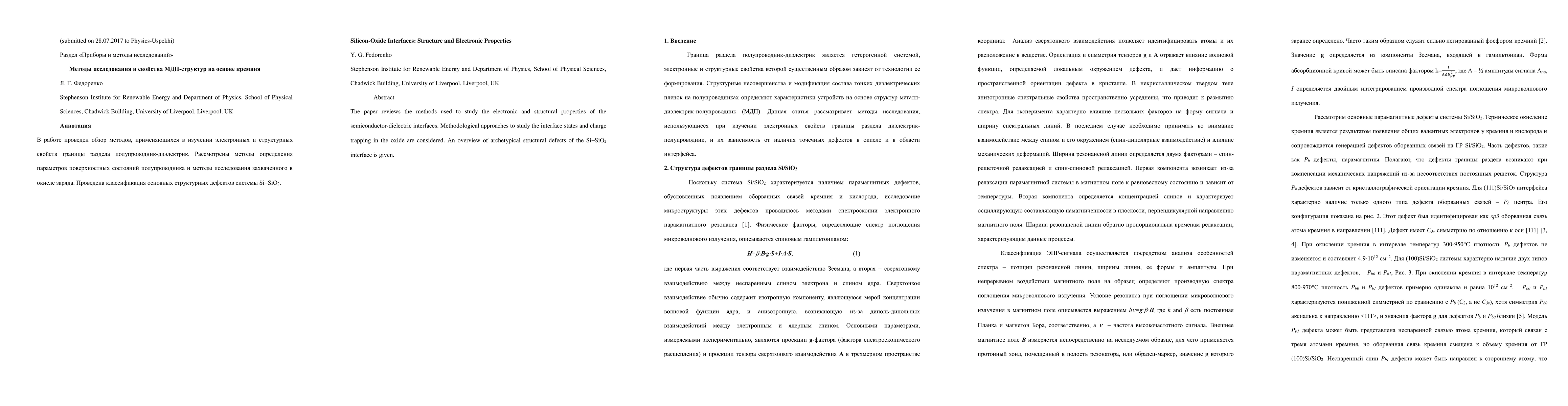 The paper reviews methods used to study the electronic and structural properties of silicon/insulator interfaces. Methodological approaches to study the interface states and charge trapping in the oxide are considered. An overview of archetypical structural defects of the Si/SiO2 interface is given.