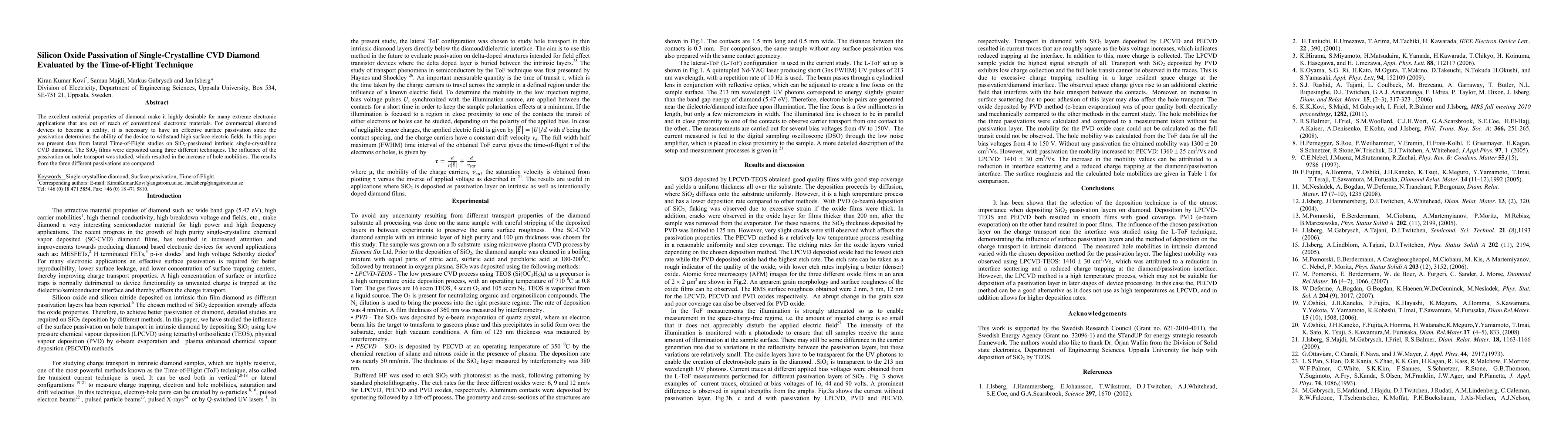 This paper investigates the effectiveness of SiO2 passivation on single-crystalline CVD diamond using lateral Time-of-Flight studies, revealing increased hole mobilities and comparing the outcomes of three different deposition techniques. Effective passivation is crucial for enabling diamond's use in extreme electronic applications.