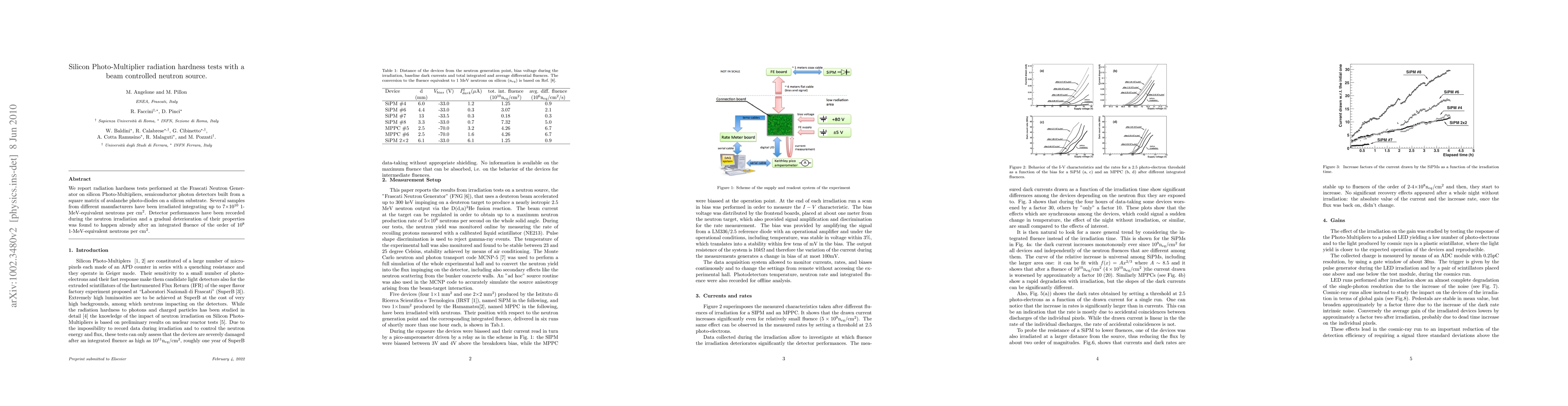 Radiation hardness tests showed silicon Photo-Multipliers deteriorate after 10^8 1-MeV-equivalent neutrons per cm^2, affecting their performance with neutron irradiation.