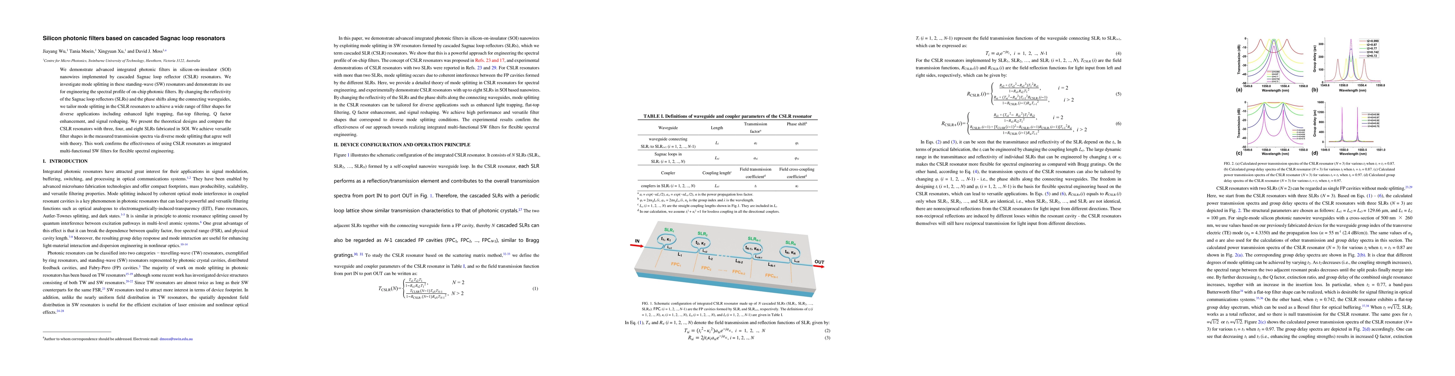 This paper demonstrates advanced silicon photonic filters using cascaded Sagnac loop resonators in silicon-on-insulator nanowires, achieving versatile filter shapes through mode splitting and phase control. The study confirms the effectiveness of these resonators for flexible spectral engineering in various applications.