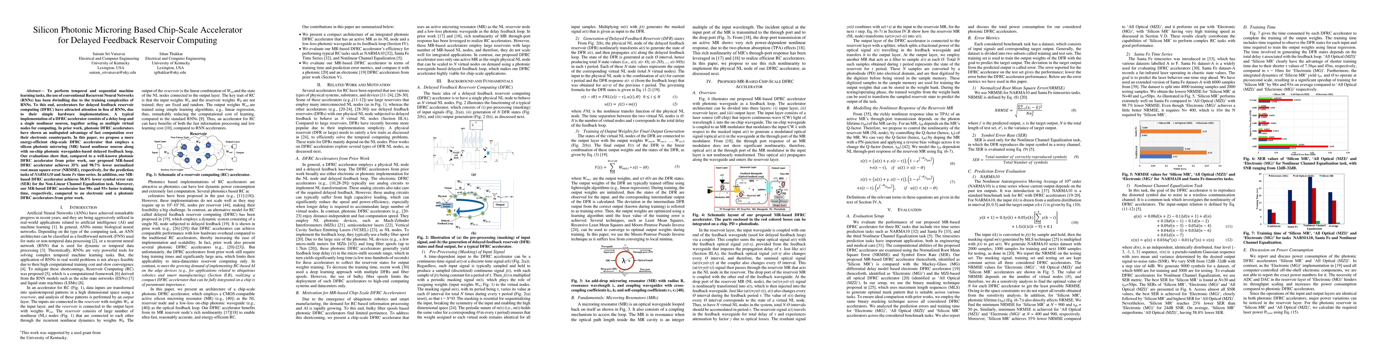 This paper proposes a silicon photonic microring-based chip-scale accelerator for delayed feedback reservoir computing (DFRC), achieving significant improvements in energy efficiency, error rates, and training speed compared to prior photonic and electronic DFRC accelerators. The proposed DFRC accelerator demonstrates superior performance in time series prediction and channel equalization tasks.