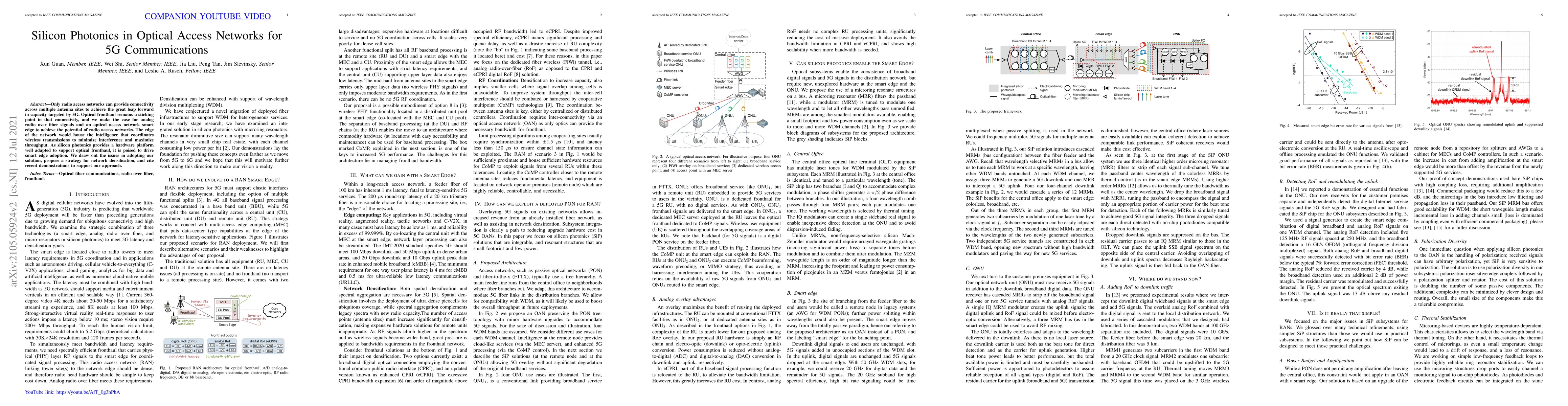 This paper argues that silicon photonics can enhance the optical fronthaul in 5G communications by enabling smart edge networks that optimize wireless transmissions. The authors propose a strategy for network densification and cite recent demonstrations to support the potential of silicon photonics in achieving 5G's capacity goals.