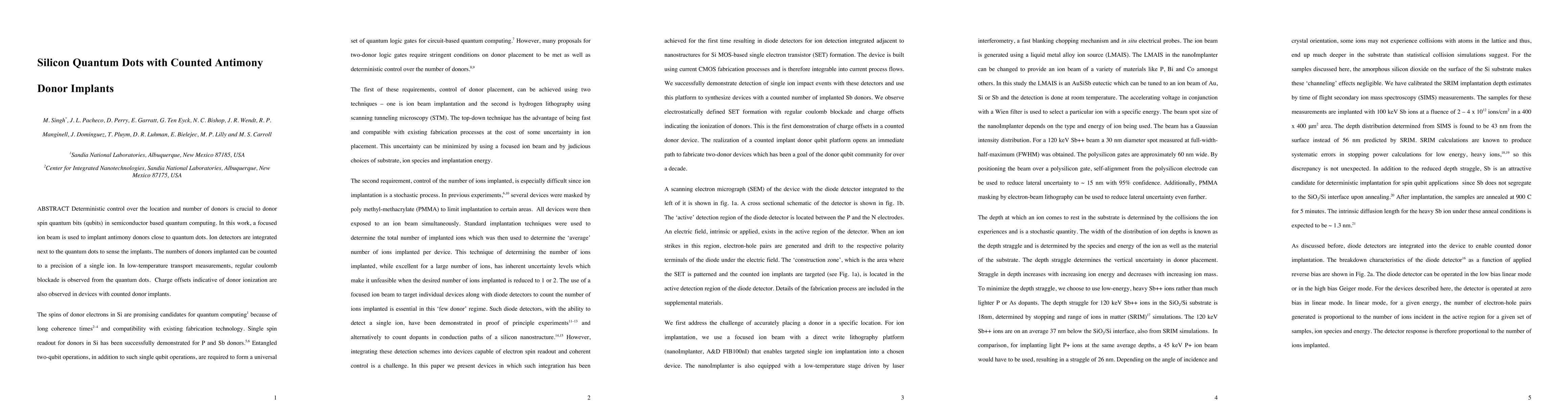 This paper details the use of a focused ion beam to precisely implant antimony donors near silicon quantum dots, enabling single-ion counting. Low-temperature transport measurements reveal regular coulomb blockade and charge offsets, confirming donor ionization in the quantum dots.