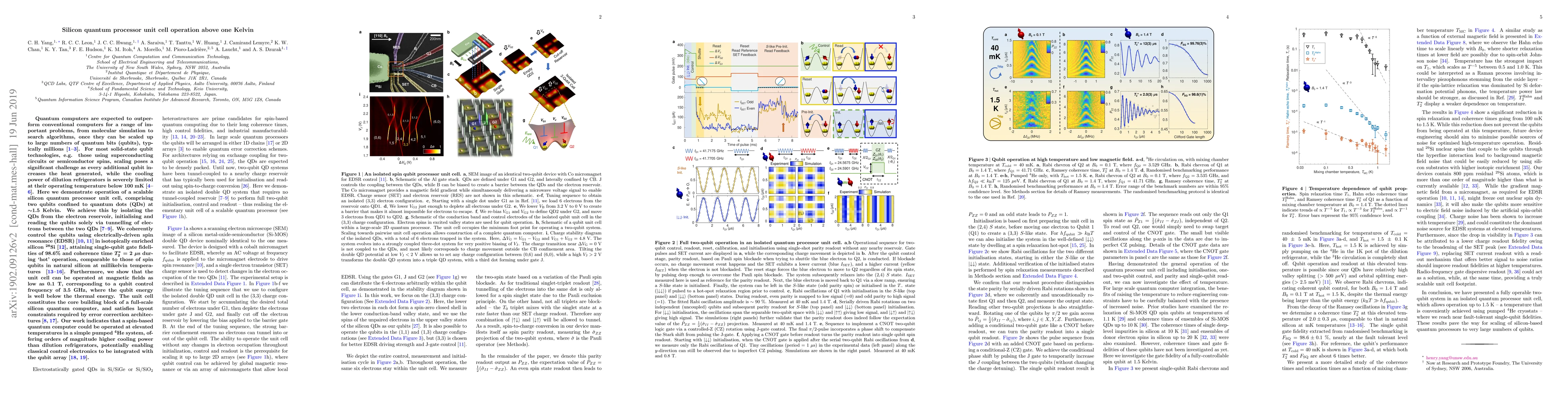 This paper demonstrates the operation of a scalable silicon quantum processor unit cell with two qubits at approximately 1.5 Kelvin, significantly above the typical millikelvin temperatures required for most quantum computing systems. The unit cell achieves high qubit coherence and control fidelity, suggesting that silicon-based quantum computers could operate at elevated temperatures using simpler cooling systems.