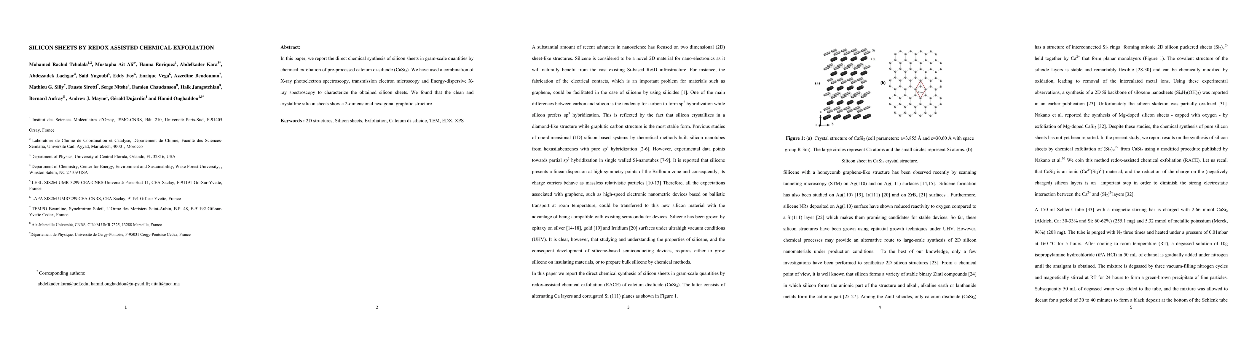 In this paper, we report the direct chemical synthesis of silicon sheets in gram-scale quantities by chemical exfoliation of pre-processed calcium di-silicide (CaSi2). We have used a combination of X-ray photoelectron spectroscopy, transmission electron microscopy and Energy-dispersive X-ray spectroscopy to characterize the obtained silicon sheets. We found that the clean and crystalline silicon sheets show a 2-dimensional hexagonal graphitic structure.