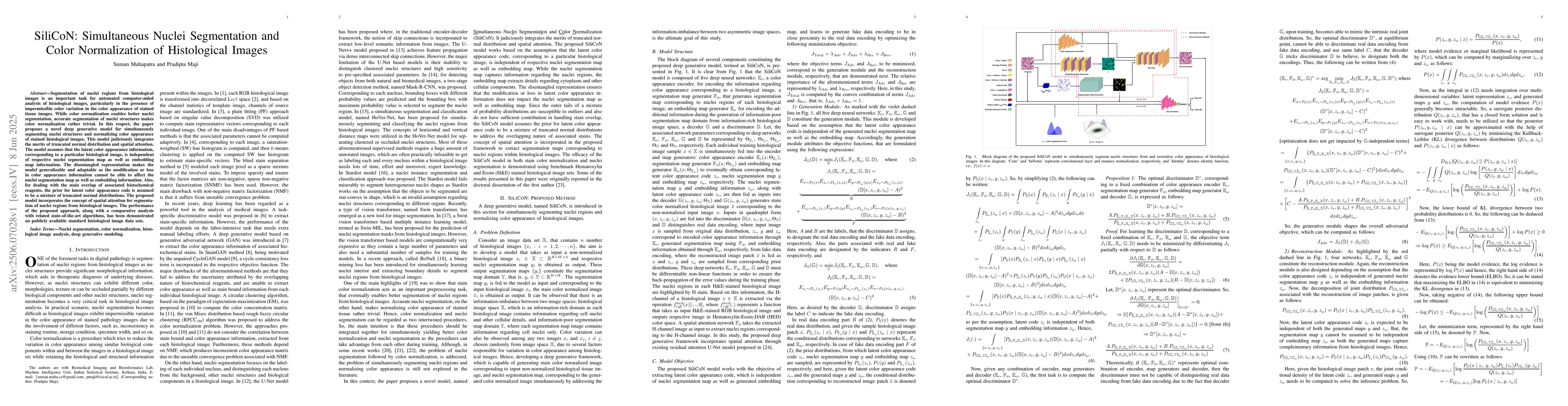 Segmentation of nuclei regions from histological images is an important task for automated computer-aided analysis of histological images, particularly in the presence of impermissible color variation in the color appearance of stained tissue images. While color normalization enables better nuclei segmentation, accurate segmentation of nuclei structures makes color normalization rather trivial. In this respect, the paper proposes a novel deep generative model for simultaneously segmenting nuclei structures and normalizing color appearance of stained histological images.This model judiciously integrates the merits of truncated normal distribution and spatial attention. The model assumes that the latent color appearance information, corresponding to a particular histological image, is independent of respective nuclei segmentation map as well as embedding map information. The disentangled representation makes the model generalizable and adaptable as the modification or loss in color appearance information cannot be able to affect the nuclei segmentation map as well as embedding information. Also, for dealing with the stain overlap of associated histochemical reagents, the prior for latent color appearance code is assumed to be a mixture of truncated normal distributions. The proposed model incorporates the concept of spatial attention for segmentation of nuclei regions from histological images. The performance of the proposed approach, along with a comparative analysis with related state-of-the-art algorithms, has been demonstrated on publicly available standard histological image data sets.