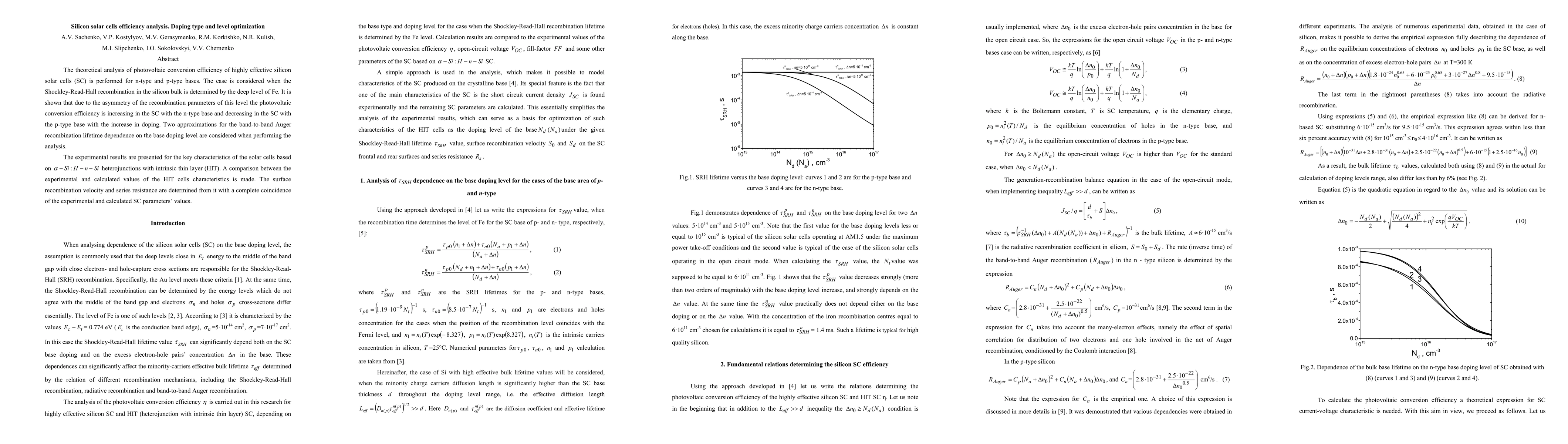 The theoretical analysis of photovoltaic conversion efficiency of highly effective silicon solar cells (SC) is performed for n-type and p-type bases. The case is considered when the Shockley-Read-Hall recombination in the silicon bulk is determined by the deep level of Fe. It is shown that due to the asymmetry of the recombination parameters of this level the photovoltaic conversion efficiency is increasing in the SC with the n-type base and decreasing in the SC with the p-type base with the increase in doping. Two approximations for the band-to-band Auger recombination lifetime dependence on the base doping level are considered when performing the analysis. The experimental results are presented for the key characteristics of the solar cells based on $\alpha-Si:H-n-Si$ heterojunctions with intrinsic thin layer (HIT). A comparison between the experimental and calculated values of the HIT cells characteristics is made. The surface recombination velocity and series resistance are determined from it with a complete coincidence of the experimental and calculated SC parameters' values.