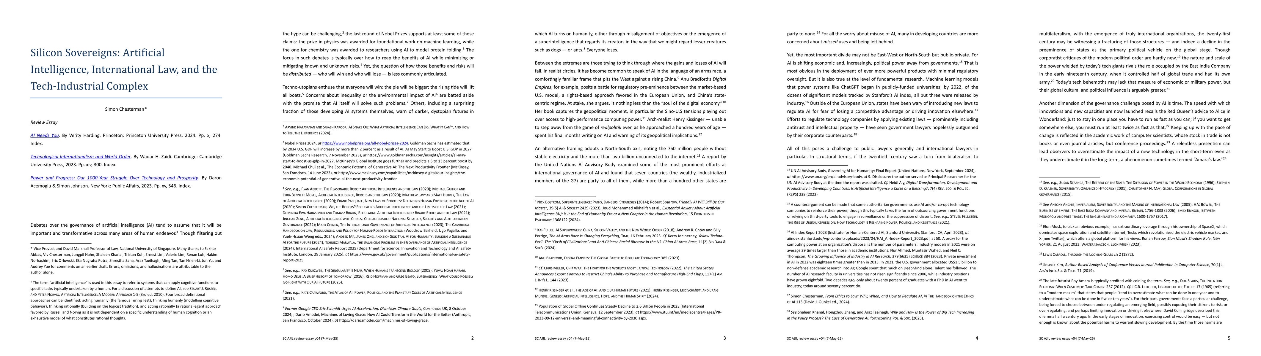 While the importance of AI governance is widely recognized, this paper uniquely emphasizes the eclipse of international institutions by a tech-industrial complex, prompting a discussion on silicon sovereignty and its implications for global equity and democracy.