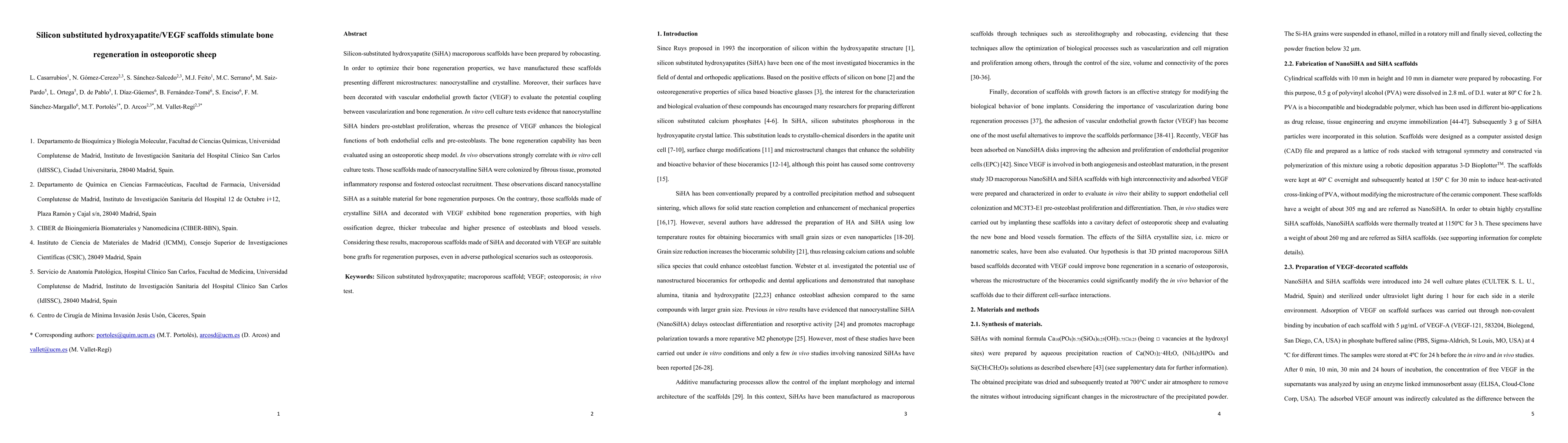 This study investigates silicon-substituted hydroxyapatite (SiHA) scaffolds with different microstructures for bone regeneration in osteoporotic sheep. Crystalline SiHA scaffolds decorated with VEGF showed significant bone regeneration, high ossification, and increased osteoblast and blood vessel presence, while nanocrystalline SiHA scaffolds were less effective.