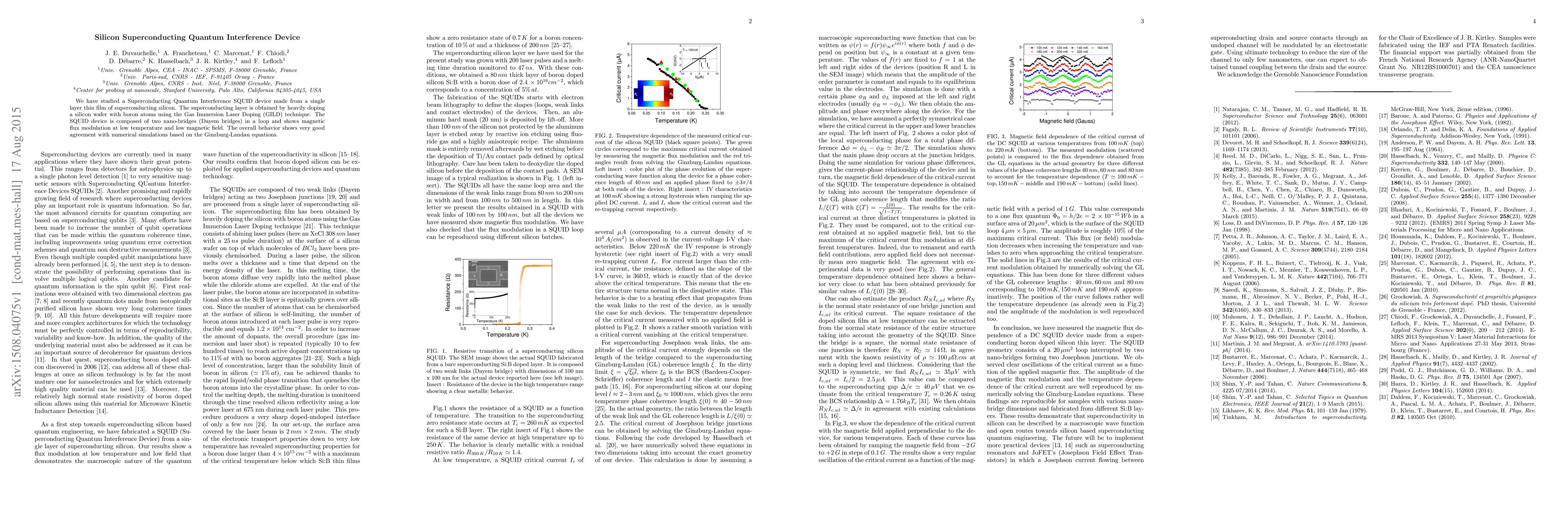 This paper investigates a superconducting SQUID device made from a heavily boron-doped silicon thin film using the GILD technique. The device exhibits magnetic flux modulation at low temperatures and fields, with behavior aligning well with Ginzburg-Landau simulations.