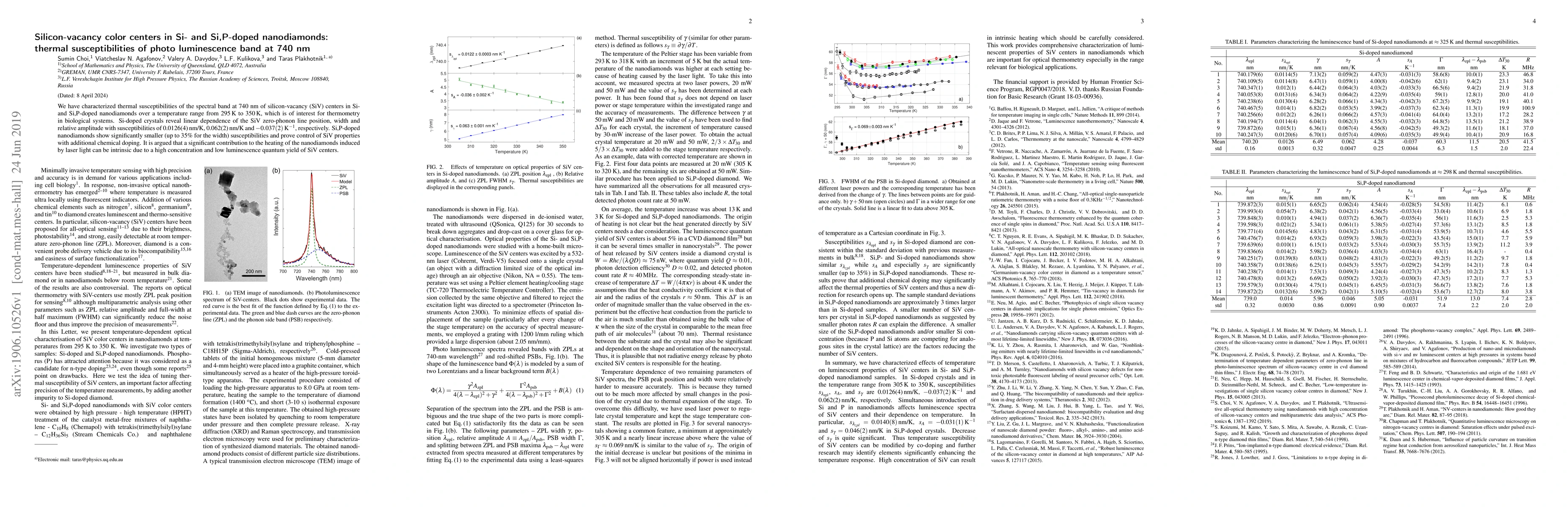 We have characterized thermal susceptibilities of the spectral band at 740 nm of silicon-vacancy (SiV) centers in Si- and Si,P-doped nanodiamonds over a temperature range from 295 K to 350 K, which is of interest for thermometry in biological systems. Si-doped crystals reveal linear dependence of the SiV zero-phonon line position, width and relative amplitude with susceptibilities of 0.0126(4) nm/K, 0.062(2) nm/K and $-0.037(2)$ K$^{-1}$, respectively. Si,P-doped nanodiamonds show significantly smaller (up to 35 % for the width) susceptibilities and prove control of SiV properties with additional chemical doping. It is argued that a significant contribution to the heating of the nanodiamonds induced by laser light can be intrinsic due to a high concentration and low luminescence quantum yield of SiV centers.