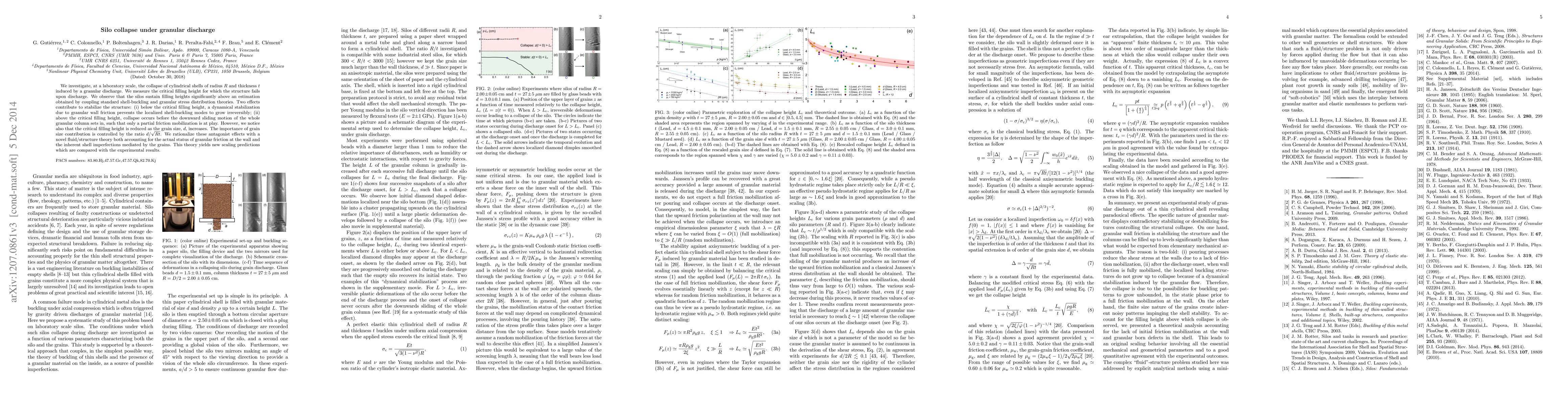 The study investigates silo collapse under granular discharge through laboratory experiments, measuring the critical filling height for structural failure and comparing it with theoretical estimations.