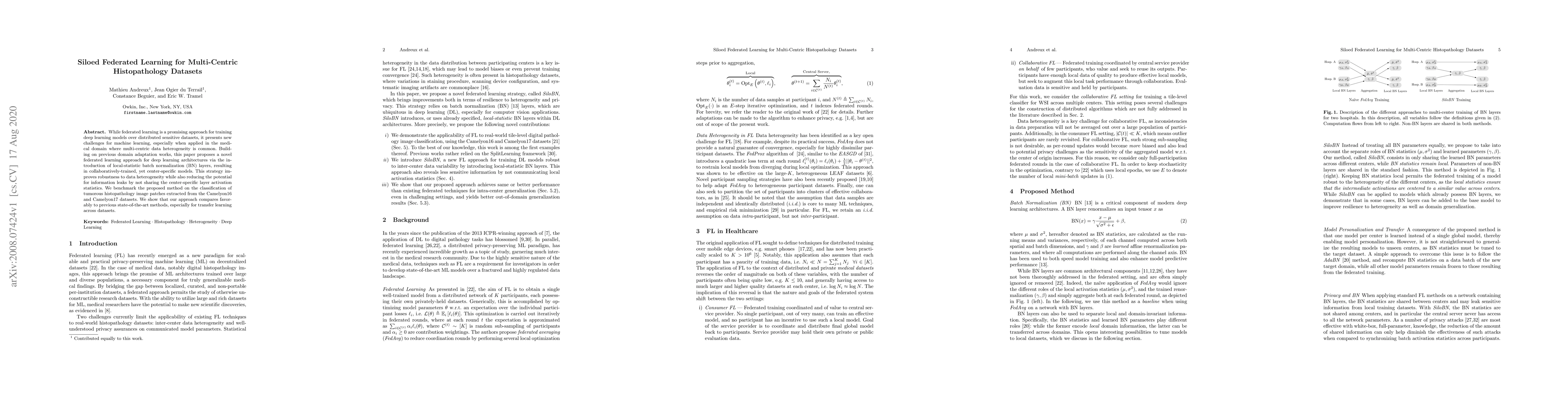 This paper proposes a siloed federated learning method with local-statistic batch normalization for training deep learning models on distributed, heterogeneous multi-centric histopathology datasets. The approach enhances robustness and privacy by avoiding the sharing of center-specific layer activation statistics, demonstrating superior performance on tumorous histopathology image classification tasks.
