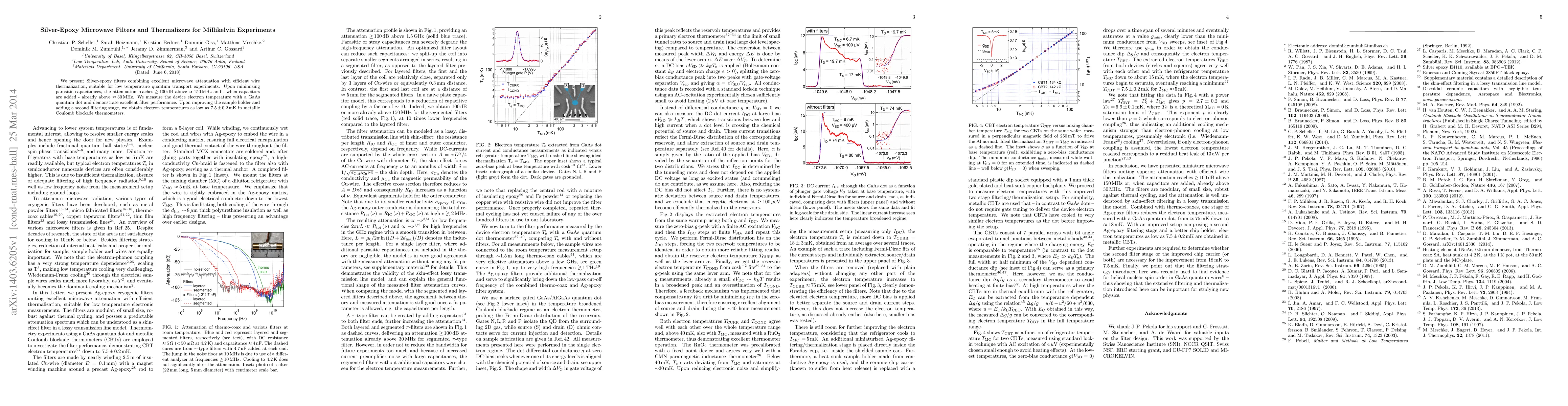 This paper introduces silver-epoxy microwave filters that offer high attenuation and effective wire thermalization for millikelvin quantum experiments. The filters achieve >100 dB attenuation above 150 MHz and improved performance with added capacitors, reaching above 30 MHz, and enable electron temperatures as low as 7.5 +/- 0.2 mK.