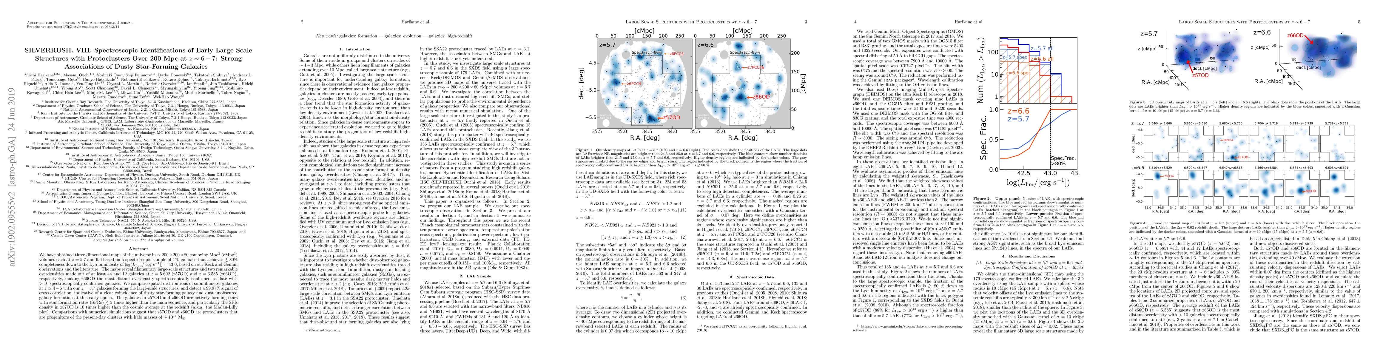 This paper identifies large-scale structures and protoclusters over 200 Mpc at redshifts z~6-7 using spectroscopic data from 179 galaxies, revealing significant overdensities with high star formation rates. The study finds a strong association between dusty star-forming galaxies and large-scale structures, suggesting these protoclusters are early precursors to present-day massive clusters.