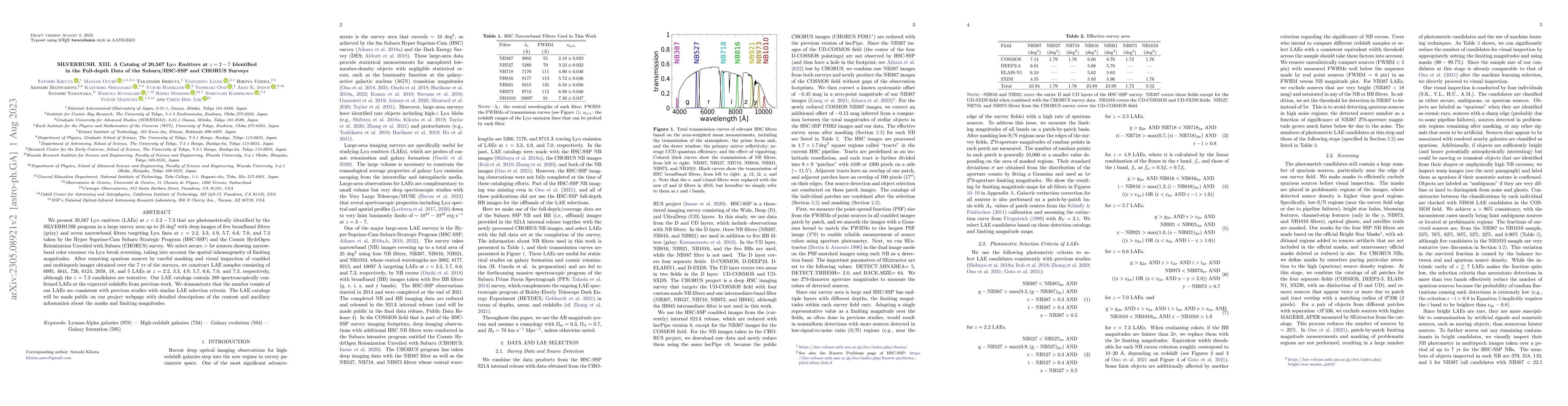 The SILVERRUSH program identifies 20,567 Ly$\alpha$ emitters (LAEs) at $z=2.2-7.3$ in a 25 deg$^2$ survey using Subaru/HSC-SSP and CHORUS data. The catalogs, which include 241 spectroscopically confirmed LAEs, will be publicly available, offering insights into early galaxy formation.
