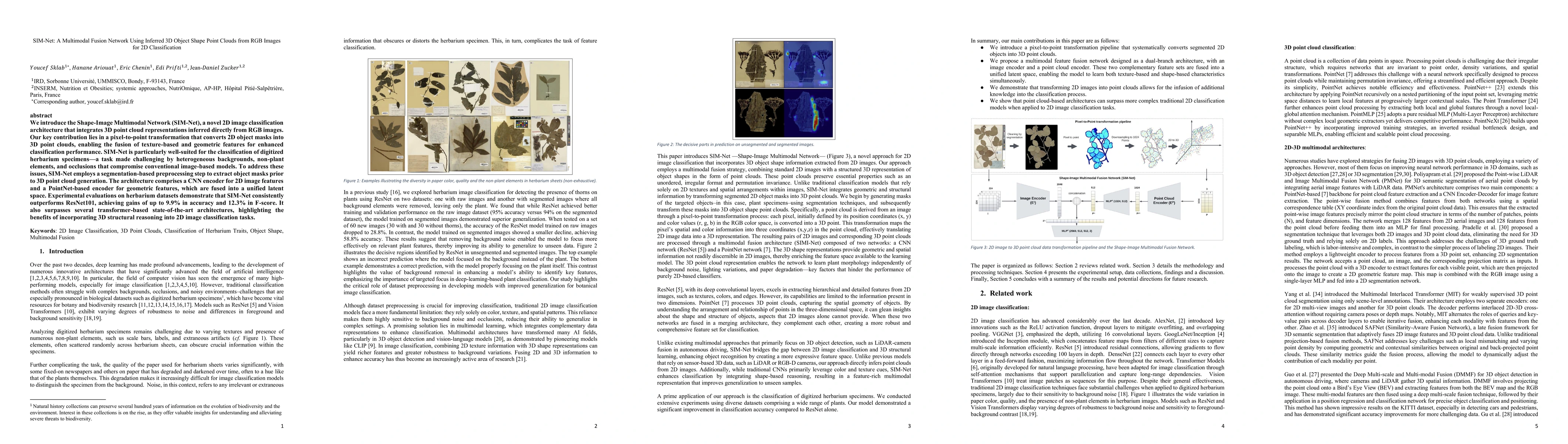 We introduce the Shape-Image Multimodal Network (SIM-Net), a novel 2D image classification architecture that integrates 3D point cloud representations inferred directly from RGB images. Our key contribution lies in a pixel-to-point transformation that converts 2D object masks into 3D point clouds, enabling the fusion of texture-based and geometric features for enhanced classification performance. SIM-Net is particularly well-suited for the classification of digitized herbarium specimens (a task made challenging by heterogeneous backgrounds), non-plant elements, and occlusions that compromise conventional image-based models. To address these issues, SIM-Net employs a segmentation-based preprocessing step to extract object masks prior to 3D point cloud generation. The architecture comprises a CNN encoder for 2D image features and a PointNet-based encoder for geometric features, which are fused into a unified latent space. Experimental evaluations on herbarium datasets demonstrate that SIM-Net consistently outperforms ResNet101, achieving gains of up to 9.9% in accuracy and 12.3% in F-score. It also surpasses several transformer-based state-of-the-art architectures, highlighting the benefits of incorporating 3D structural reasoning into 2D image classification tasks.