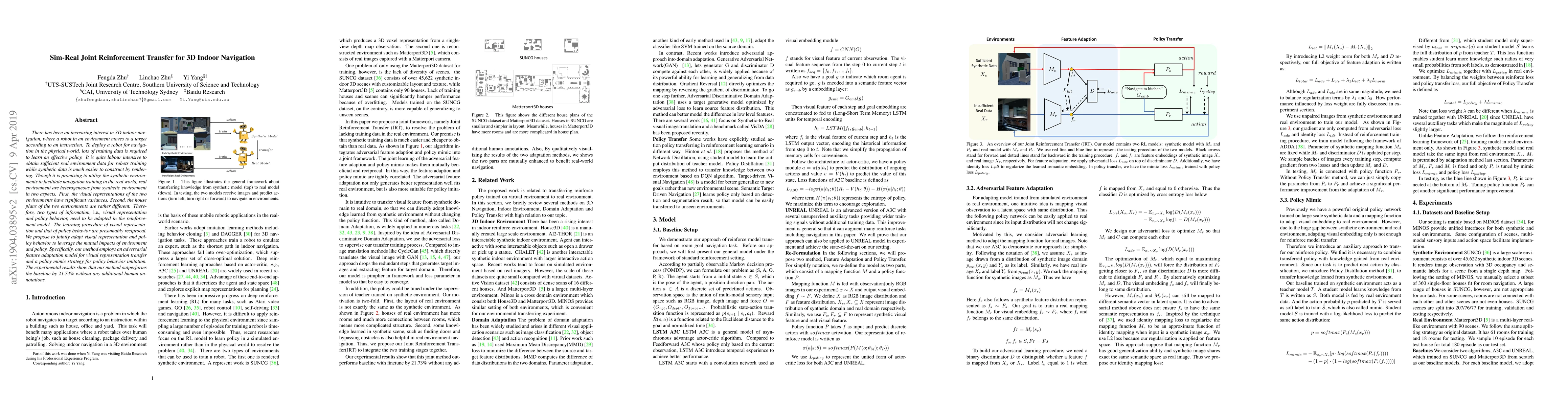 This paper proposes a method for 3D indoor navigation that combines synthetic and real environment training data. It uses adversarial feature adaptation for visual representation and a policy mimic strategy to bridge the differences between synthetic and real environments, achieving a 19.47% improvement over baselines without additional human annotations.