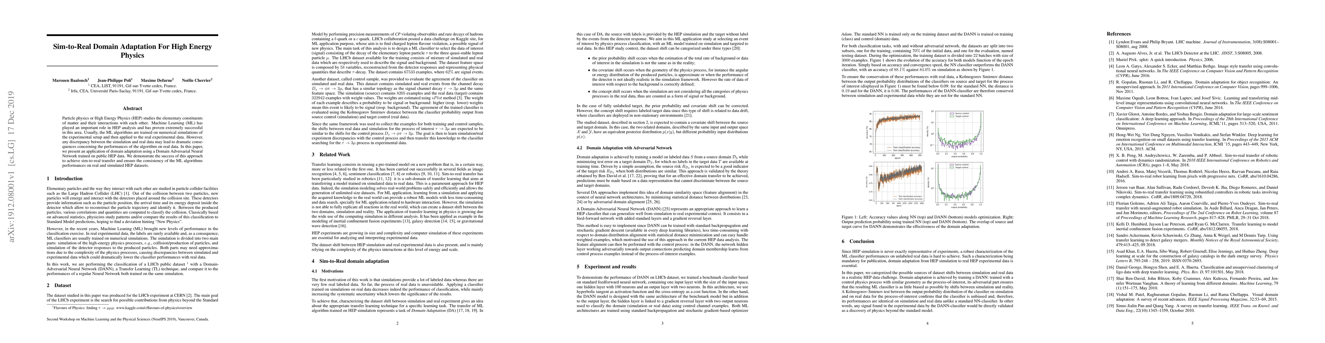 Particle physics or High Energy Physics (HEP) studies the elementary constituents of matter and their interactions with each other. Machine Learning (ML) has played an important role in HEP analysis and has proven extremely successful in this area. Usually, the ML algorithms are trained on numerical simulations of the experimental setup and then applied to the real experimental data. However, any discrepancy between the simulation and real data may lead to dramatic consequences concerning the performances of the algorithm on real data. In this paper, we present an application of domain adaptation using a Domain Adversarial Neural Network trained on public HEP data. We demonstrate the success of this approach to achieve sim-to-real transfer and ensure the consistency of the ML algorithms performances on real and simulated HEP datasets.