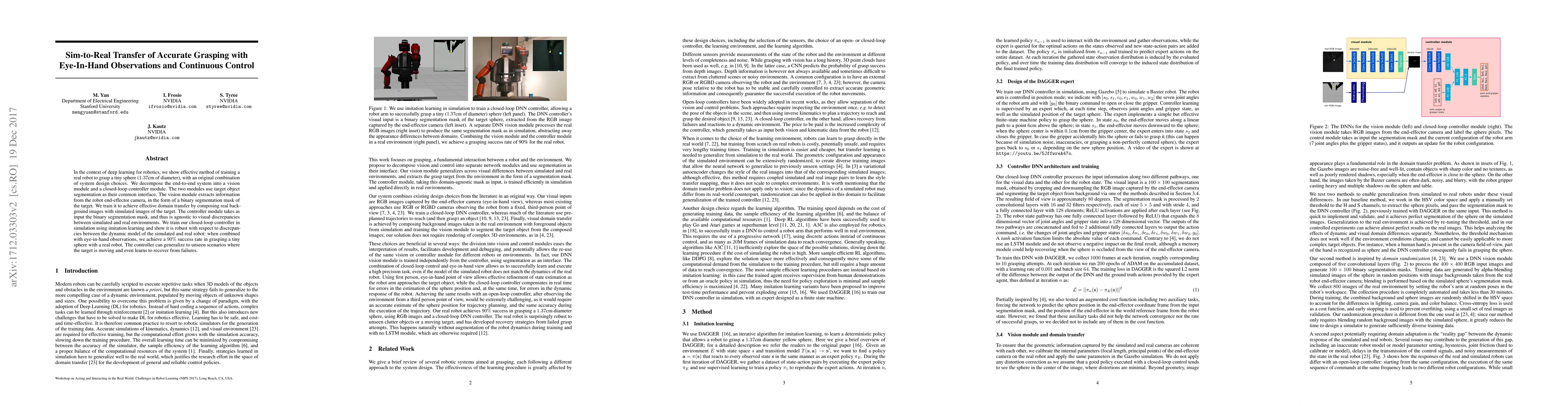 In the context of deep learning for robotics, we show effective method of training a real robot to grasp a tiny sphere (1.37cm of diameter), with an original combination of system design choices. We decompose the end-to-end system into a vision module and a closed-loop controller module. The two modules use target object segmentation as their common interface. The vision module extracts information from the robot end-effector camera, in the form of a binary segmentation mask of the target. We train it to achieve effective domain transfer by composing real background images with simulated images of the target. The controller module takes as input the binary segmentation mask, and thus is agnostic to visual discrepancies between simulated and real environments. We train our closed-loop controller in simulation using imitation learning and show it is robust with respect to discrepancies between the dynamic model of the simulated and real robot: when combined with eye-in-hand observations, we achieve a 90% success rate in grasping a tiny sphere with a real robot. The controller can generalize to unseen scenarios where the target is moving and even learns to recover from failures.