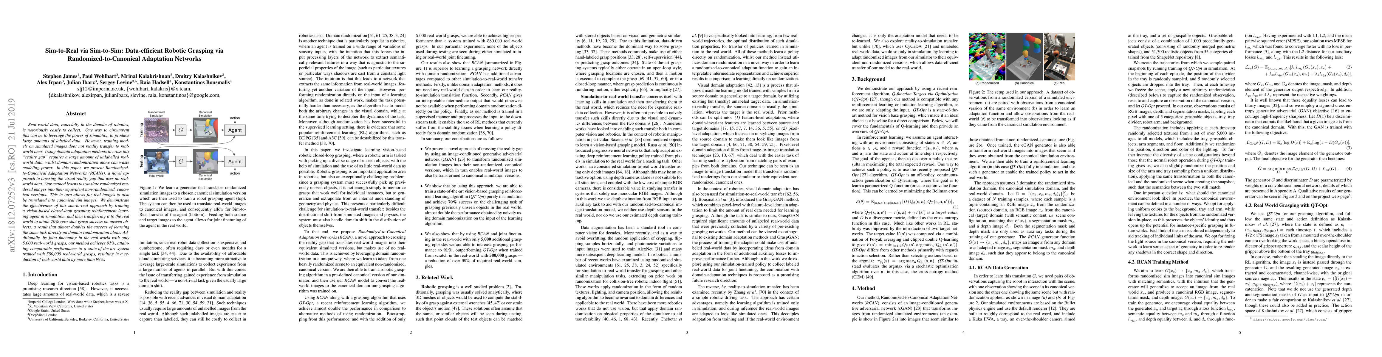 This paper introduces Randomized-to-Canonical Adaptation Networks (RCANs) to bridge the sim-to-real gap in robotic grasping without requiring real-world data. It leverages domain adaptation to translate simulated randomized images into canonical versions, enabling successful transfer to real-world tasks with minimal real-world data.