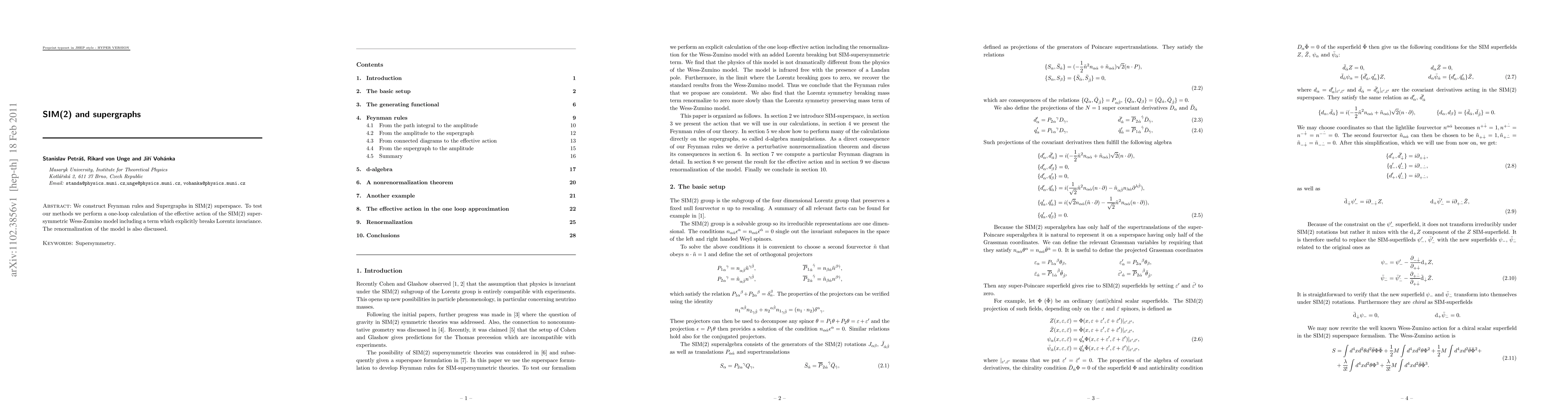 We construct Feynman rules and Supergraphs in SIM(2) superspace. To test our methods we perform a one-loop calculation of the effective action of the SIM(2) supersymmetric Wess-Zumino model including a term which explicitly breaks Lorentz invariance. The renormalization of the model is also discussed.