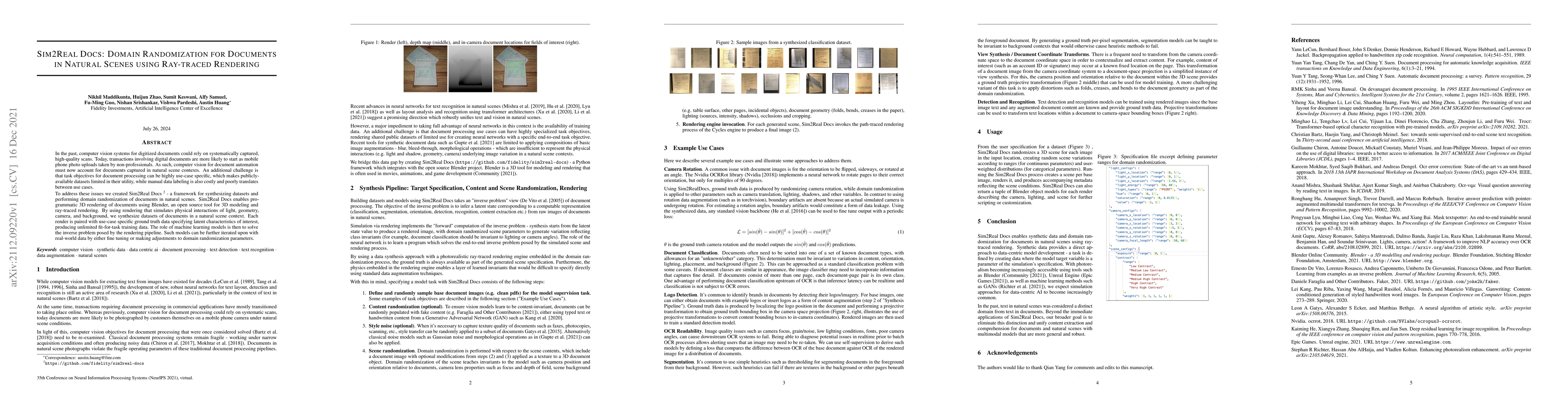 Researchers created Sim2Real Docs to generate realistic document datasets in natural scenes through 3D rendering, enabling training of machine learning models for domain-specific tasks with unlimited data.