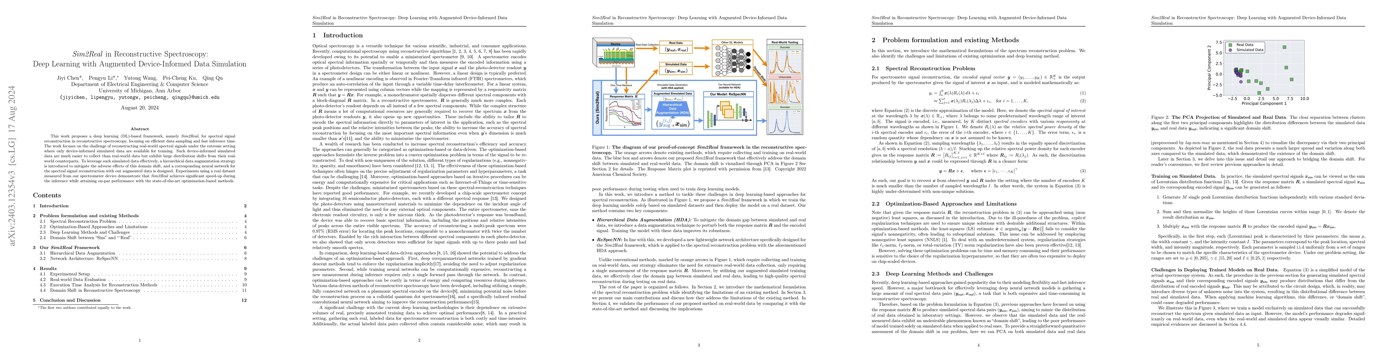 This paper proposes Sim2Real, a deep learning framework for spectral signal reconstruction in spectroscopy, focusing on efficient data sampling and fast inference time. The framework addresses the challenge of reconstructing real-world spectral signals using only device-informed simulated data for training, which are easier to collect but have distribution shifts from real-world data. Hierarchical data augmentation is introduced to mitigate domain shift, and a lightweight neural network, ReSpecNN, is designed for spectral signal reconstruction.