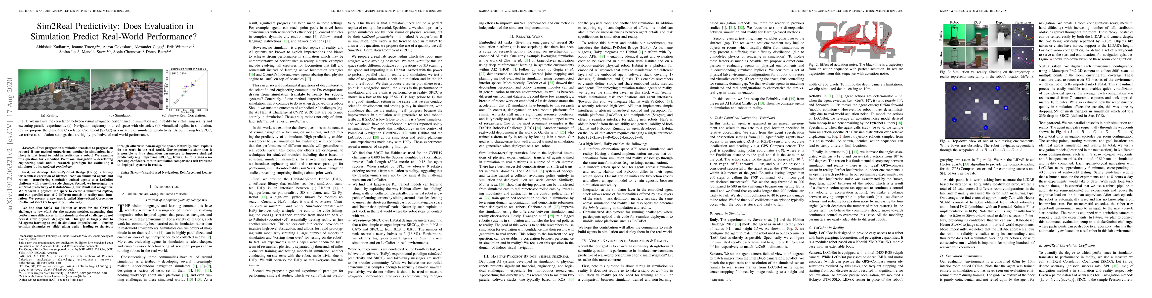 This paper investigates whether performance improvements in simulation predict real-world success for robots navigating PointGoal tasks. It develops tools like HaPy for code execution across simulated and real robots, and finds that Habitat-Sim's low Sim-vs-Real Correlation Coefficient (0.18) indicates poor sim2real predictivity, largely due to agents exploiting simulator flaws. However, tuning simulation parameters can significantly improve this predictivity (up to 0.844).