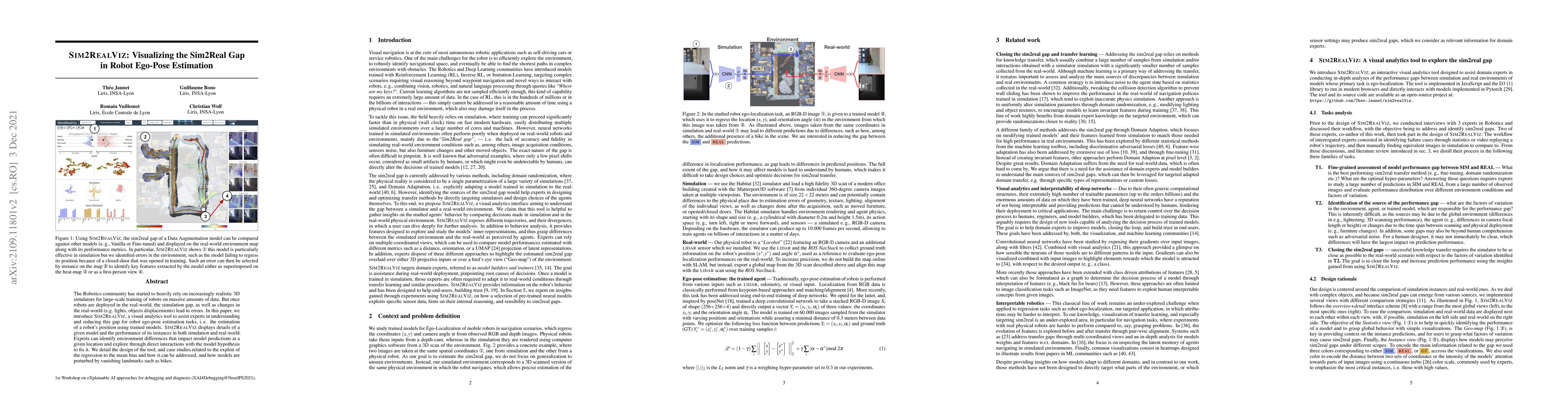 This paper introduces Sim2RealViz, a tool to help experts understand and reduce errors between simulated and real-world robot ego-pose estimation. It provides visual analytics for identifying environment differences that impact model predictions.