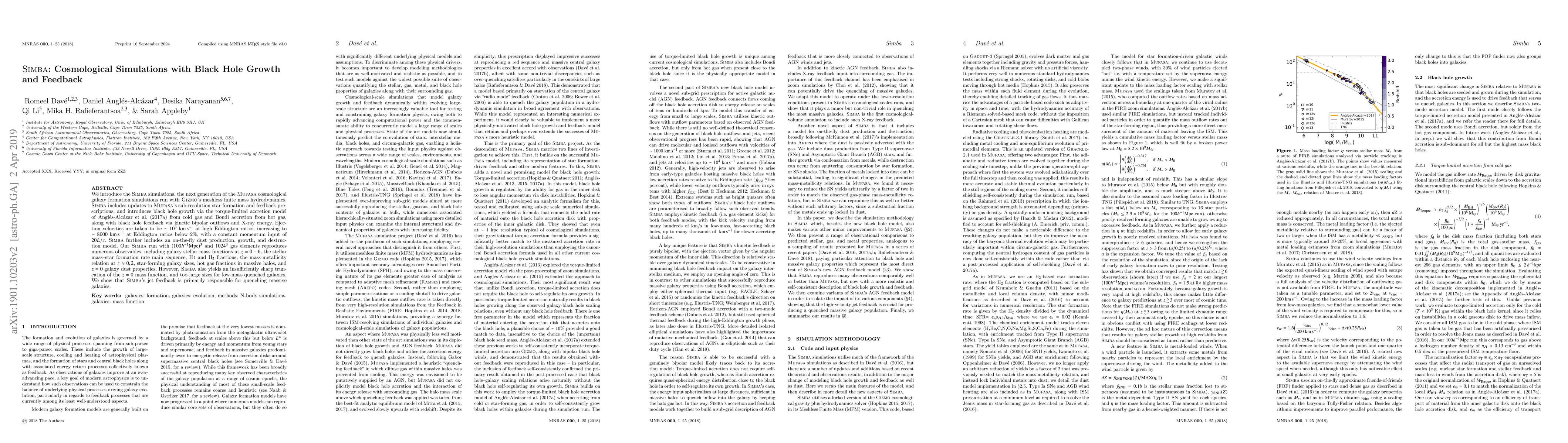 The Simba simulations advance the Mufasa cosmological galaxy formation models by incorporating black hole growth and feedback mechanisms, including torque-limited accretion and kinetic bipolar outflows. Despite reproducing numerous galaxy observables, Simba shows discrepancies in the low-mass galaxy size and mass function truncation.