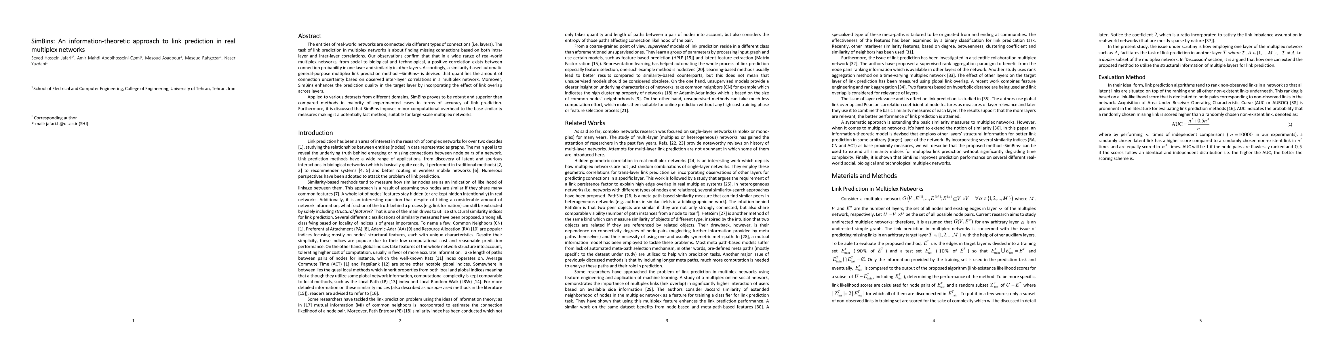 SimBins is an information-theoretic method for predicting missing links in multiplex networks by leveraging inter-layer correlations and link overlap, demonstrating superior accuracy and minimal computational overhead across diverse datasets.