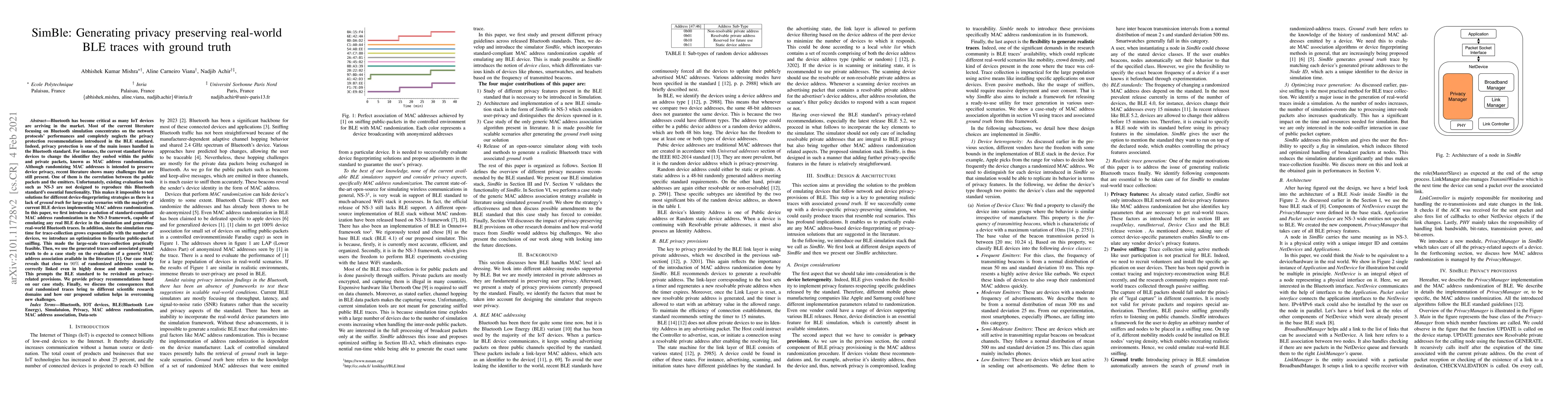 Bluetooth has become critical as many IoT devices are arriving in the market. Most of the current literature focusing on Bluetooth simulation concentrates on the network protocols' performances and completely neglects the privacy protection recommendations introduced in the BLE standard. Indeed, privacy protection is one of the main issues handled in the Bluetooth standard. For instance, the current standard forces devices to change the identifier they embed within the public and private packets, known as MAC address randomization. Although randomizing MAC addresses is intended to preserve device privacy, recent literature shows many challenges that are still present. One of them is the correlation between the public packets and the emitters. Unfortunately, existing evaluation tools such as NS-3 are not designed to reproduce this Bluetooth standard's essential functionality. This makes it impossible to test solutions for different device-fingerprinting strategies as there is a lack of ground truth for large-scale scenarios with the majority of current BLE devices implementing MAC address randomization. In this paper, we first introduce a solution of standard-compliant MAC address randomization in the NS-3 framework, capable of emulating any real BLE device in the simulation and generating real-world Bluetooth traces. In addition, since the simulation run-time for trace-collection grows exponentially with the number of devices, we introduce an optimization to linearize public-packet sniffing. This made the large-scale trace-collection practically feasible. Then, we use the generated traces and associated ground truth to do a case study on the evaluation of a generic MAC address association available in the literature. Our case study reveals that close to 90 percent of randomized addresses could be correctly linked even in highly dense and mobile scenarios.