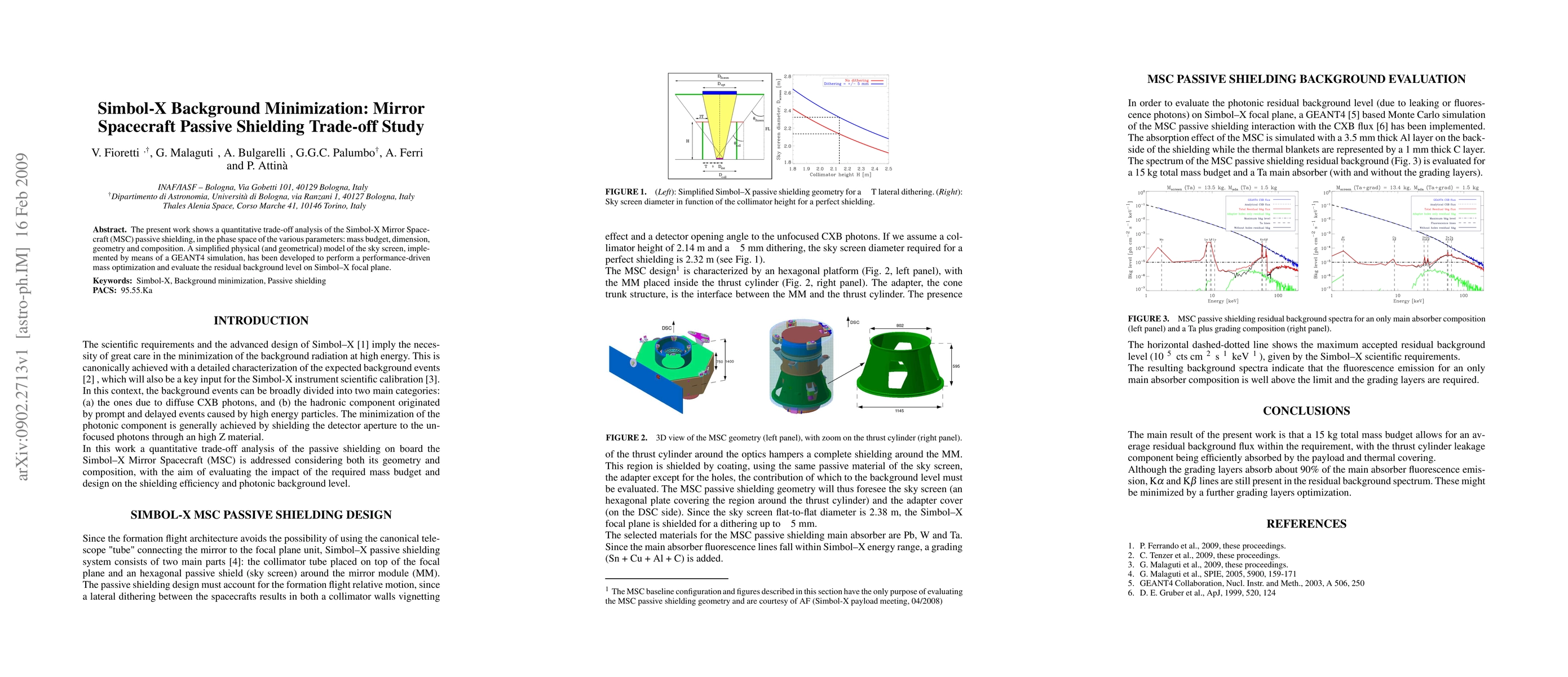 This study quantitatively analyzes the trade-offs of Simbol-X Mirror Spacecraft passive shielding concerning mass, dimensions, geometry, and material composition, using a GEANT4 simulation to optimize mass and assess residual background levels on the focal plane.